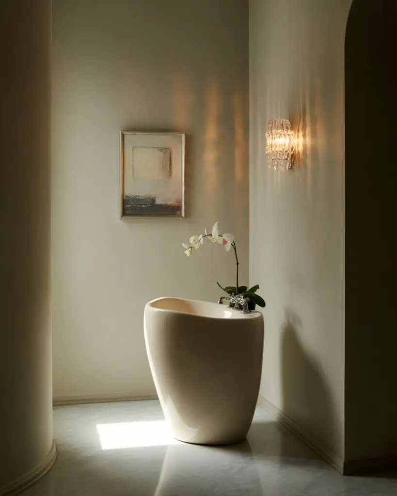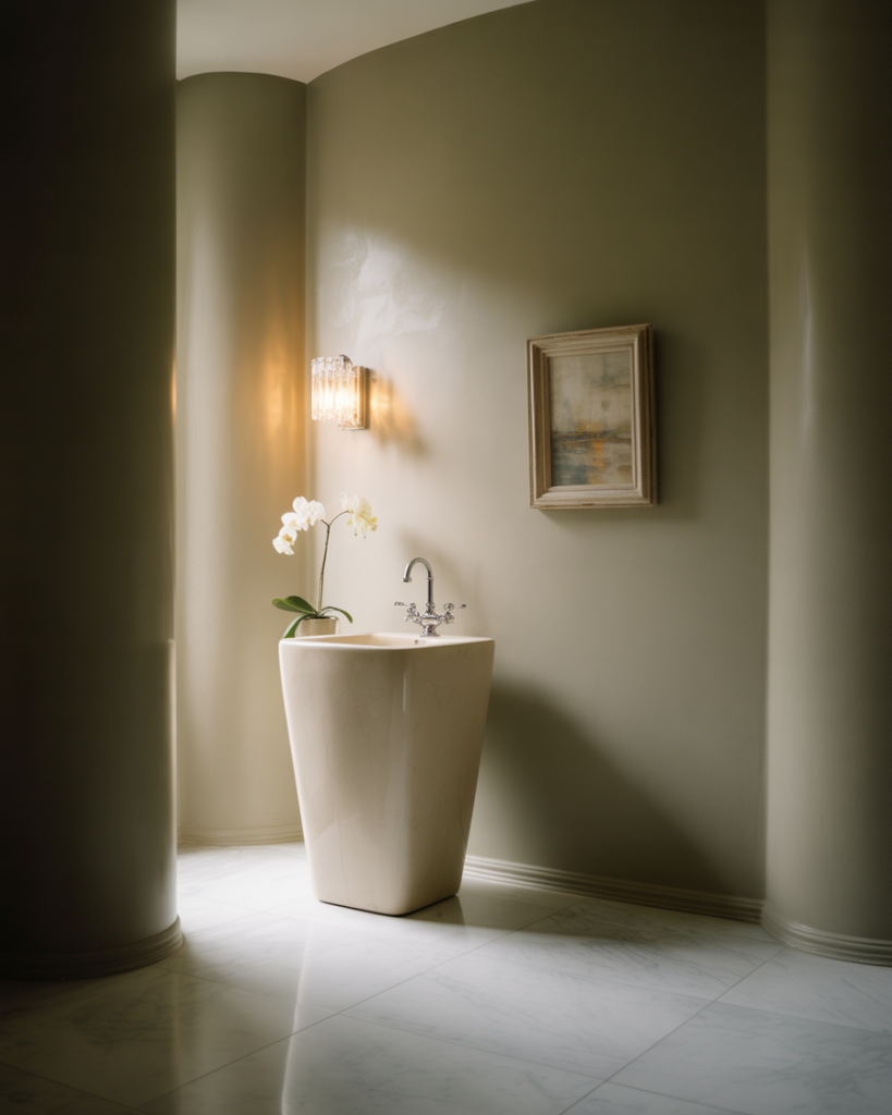 The pedestal sink is having a renaissance, particularly in elegant tiny powder rooms where floor space is at a premium. Modern luxury versions come in sculptural shapes that function as art pieces, with smooth curves and unexpected proportions that elevate the humble sink into something gallery-worthy. This choice creates visual lightness—without a bulky vanity, even a cramped powder room can feel surprisingly open and breathable.