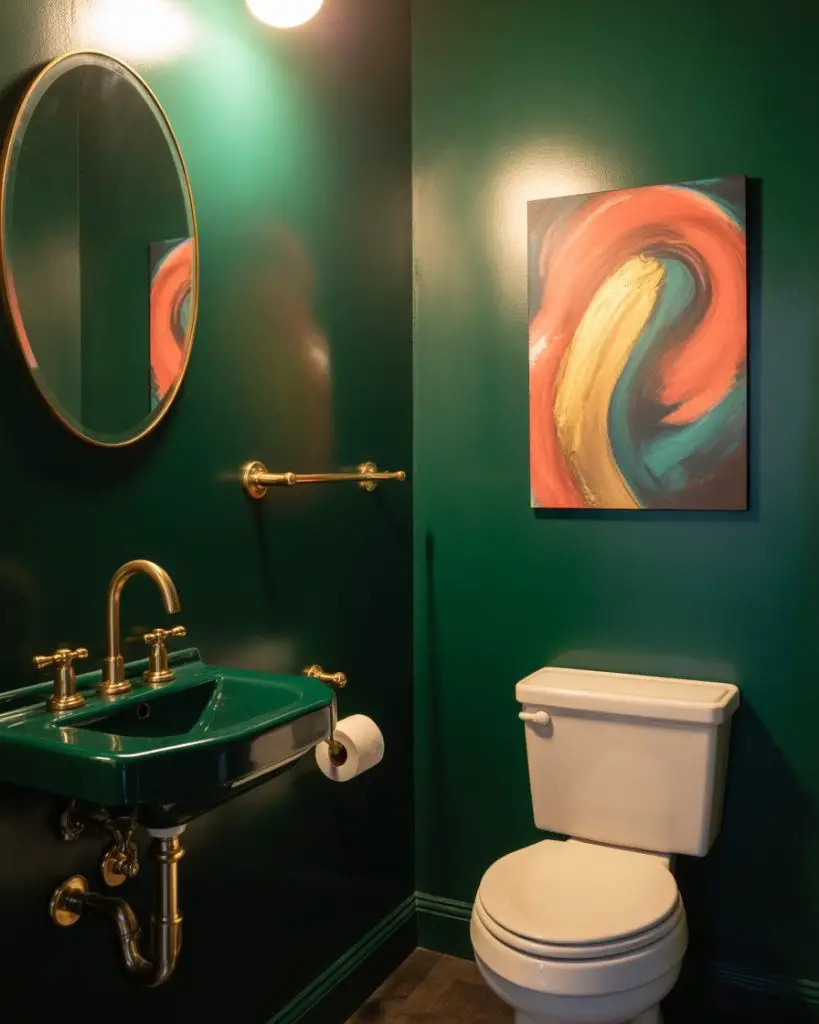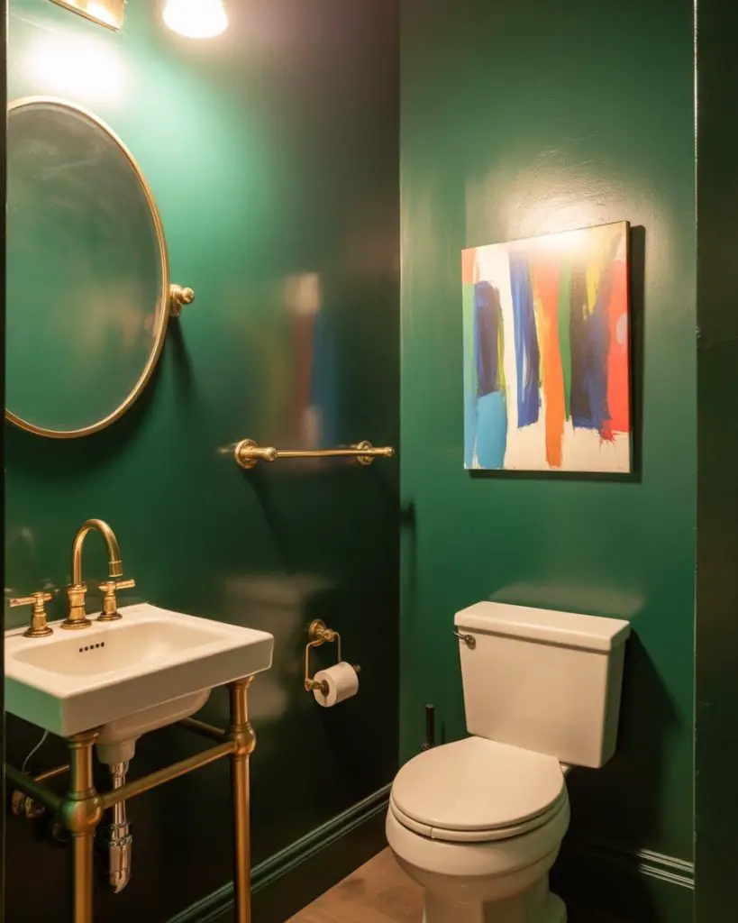 A tiny powder room is the perfect place to experiment with that bold paint color you’d never commit to in a larger space. Fun jewel tones like emerald green, sapphire blue, or even millennial pink work beautifully when you only need one gallon of paint and minimal time commitment. The confined space actually intensifies the color experience, wrapping you in pigment in a way that feels intentional and designed rather than overwhelming.