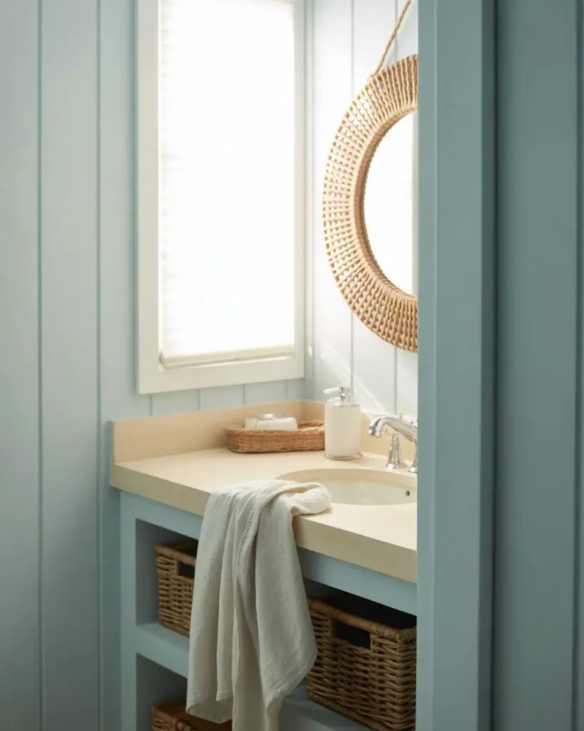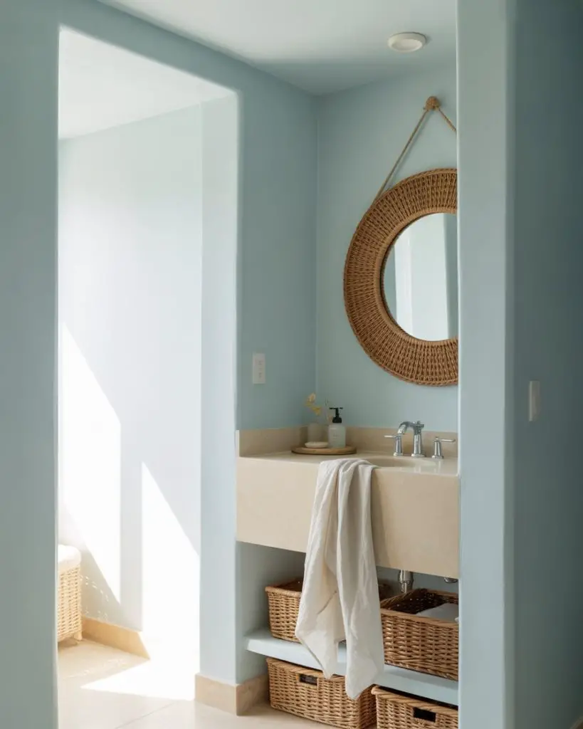 The coastal powder room has evolved beyond nautical clichés into something more sophisticated and organic modern. We’re seeing soft blues and sandy neutral tones paired with natural materials—rattan mirrors, driftwood-inspired shelving, and handmade ceramic sinks that feel artisan rather than mass-produced. This aesthetic captures the relaxed elegance of seaside living without a single anchor or rope in sight.