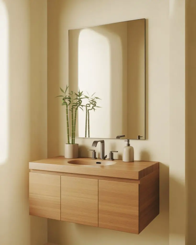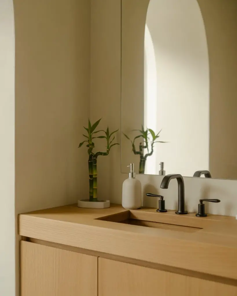 The Japandi powder room fuses Japanese minimalism with Scandinavian coziness, creating a space that’s both pared-down and inviting. Clean lines dominate, but earthy materials like oak, bamboo, and clay keep things from feeling sterile. This aesthetic prizes negative space as much as the objects within it—every element serves a purpose, and nothing feels arbitrary or excessive.