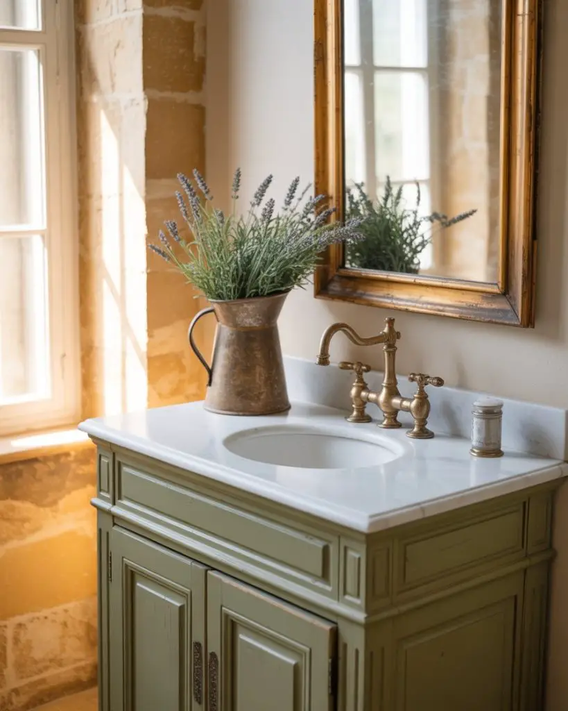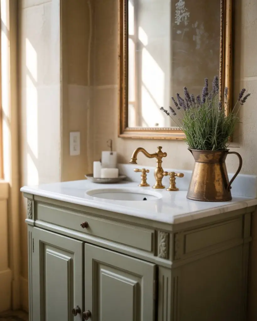 The French country powder room brings Provincial warmth to American homes through curated vintage touches and soft, aged finishes. Think worn limestone floors, a painted vanity with delicate hardware, and perhaps an antique mirror with its original silvering showing through. These spaces feel collected rather than decorated, as if each element has a story and arrived over time rather than all at once from a single retailer.
