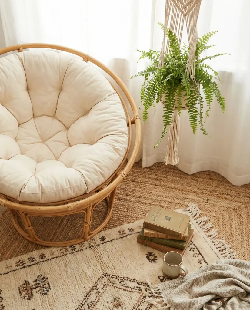 A boho reading corner leans into earthy textures and handmade details—macramé wall hangings, woven baskets, and rattan furniture all play a role. This style is especially popular among younger homeowners who want a laid-back, collected-over-time feel that’s equal parts cozy and visually rich. Layer in a sheepskin throw or a jute rug to enhance the tactile experience.