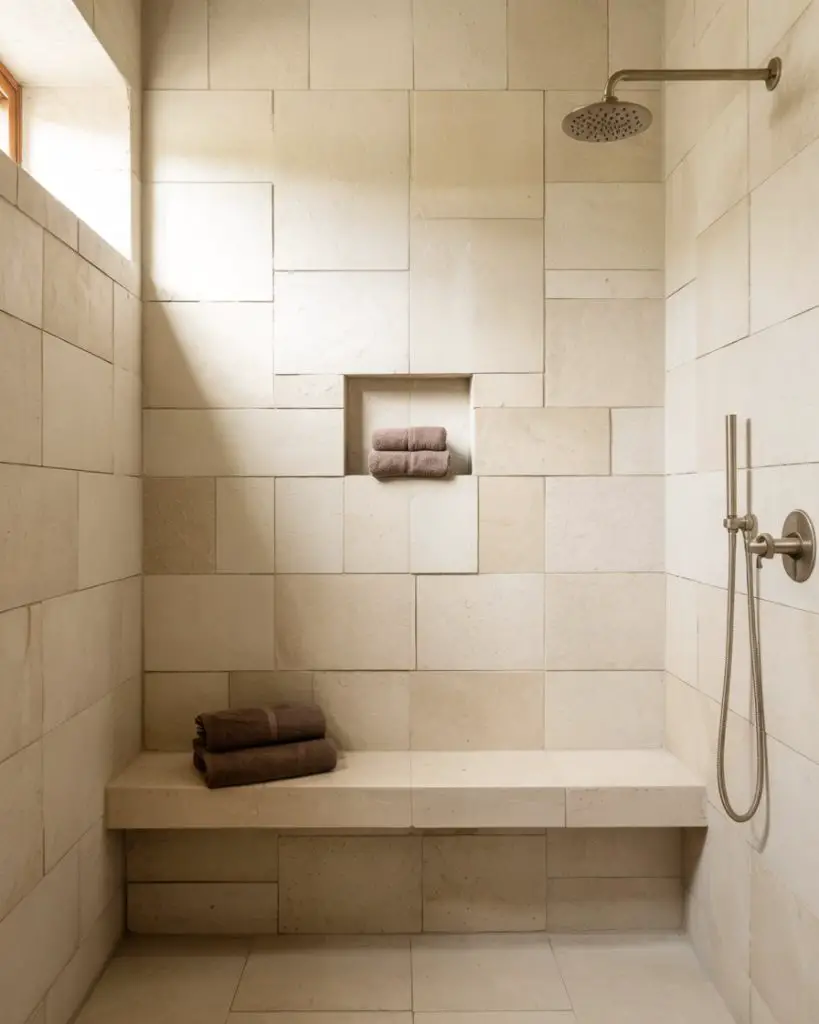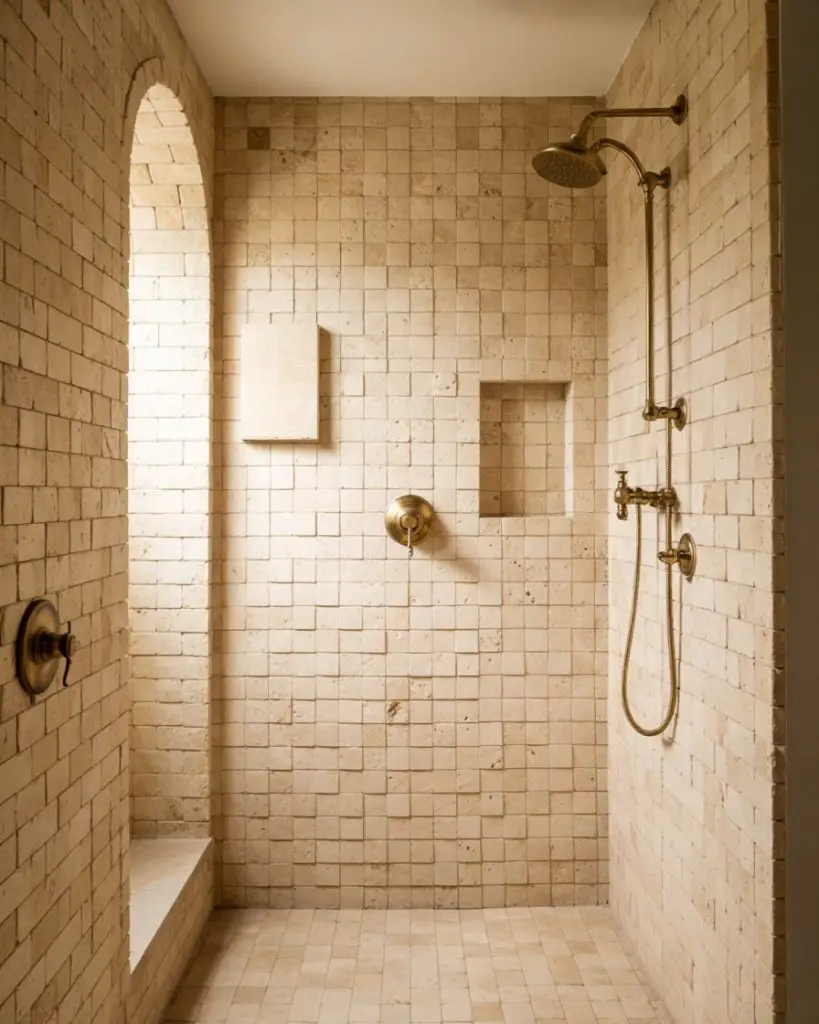 One thing to know: travertine requires sealing and regular maintenance, especially in a shower where it’s constantly exposed to water. But for many homeowners, the trade-off is worth it. The stone develops a beautiful patina over time and feels incredibly high-end. It’s also cooler to the touch than porcelain, which can be a nice bonus in warmer climates. Just budget for professional sealing every year or two to keep it looking its best.