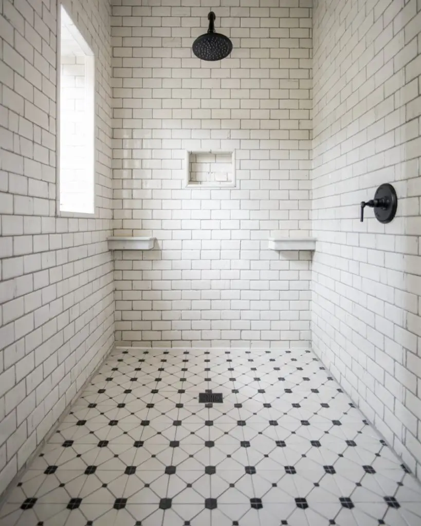 For a bold, graphic look, nothing beats black and white geometric tile. Think chevrons, diamonds, or even Moroccan-inspired shapes arranged in high-contrast patterns. This style works beautifully in classic or eclectic bathrooms and adds instant personality. In 2026, these tiles are often used on shower floors or as a feature wall, paired with simple white field tile to keep the overall look balanced.