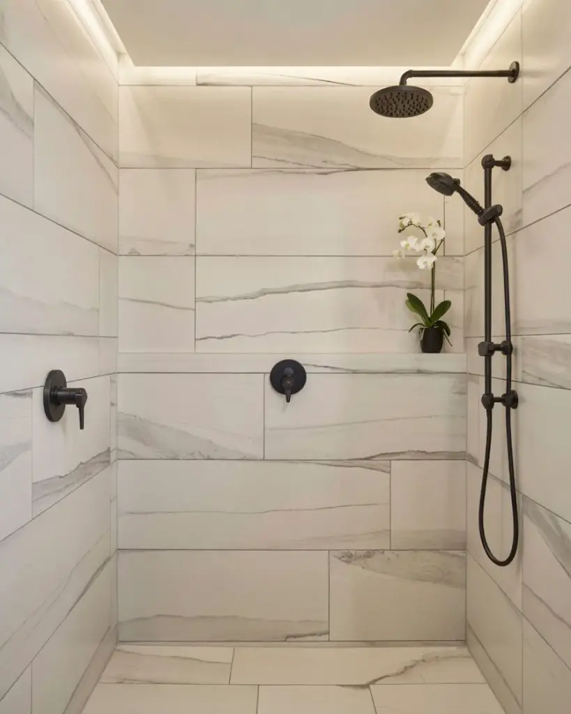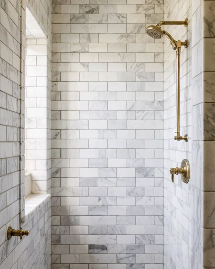 Real marble does require maintenance—it’s porous and can stain if not sealed regularly—but many homeowners feel the beauty is worth the extra effort. If you love the look but want less upkeep, porcelain marble-look tile has come a long way and is nearly indistinguishable from the real thing. Either way, marble (or its lookalike) brings an undeniable sense of refinement and permanence to a shower space.