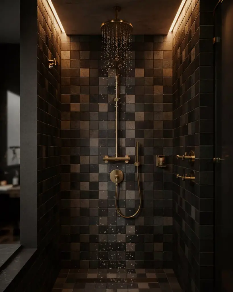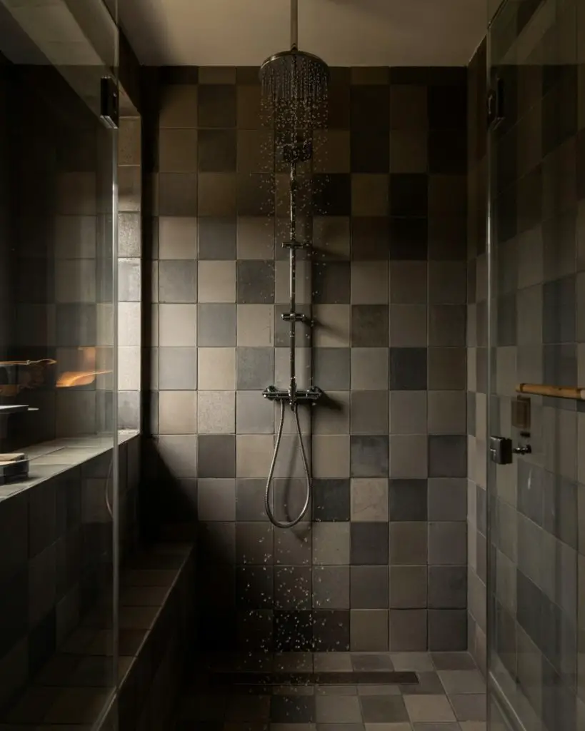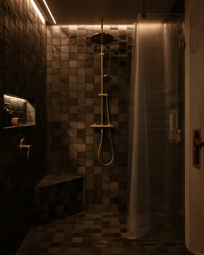 This is where lighting becomes crucial. Without proper illumination, dark tile can feel oppressive rather than cozy. Consider adding a skylight, installing dimmable recessed lights, or using backlit mirrors to keep the space feeling warm and inviting. It’s also smart to use lighter grout—a contrasting grout line adds dimension and prevents the space from feeling like a black box.