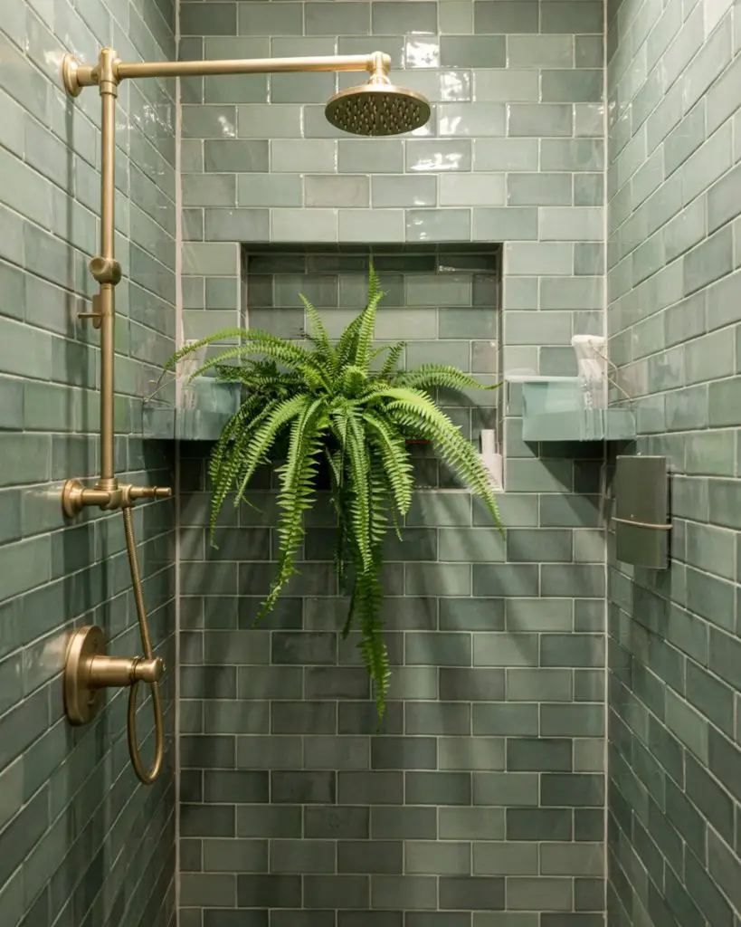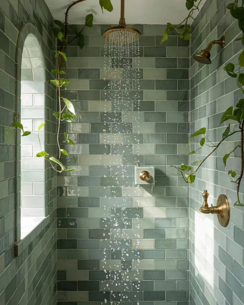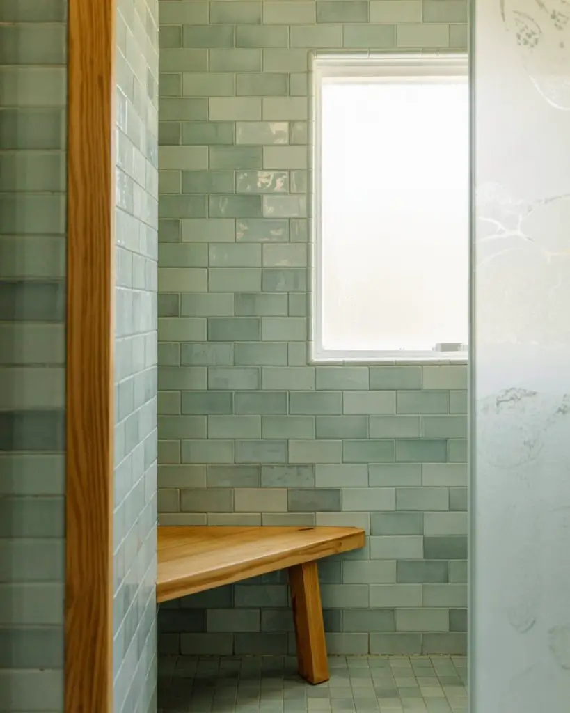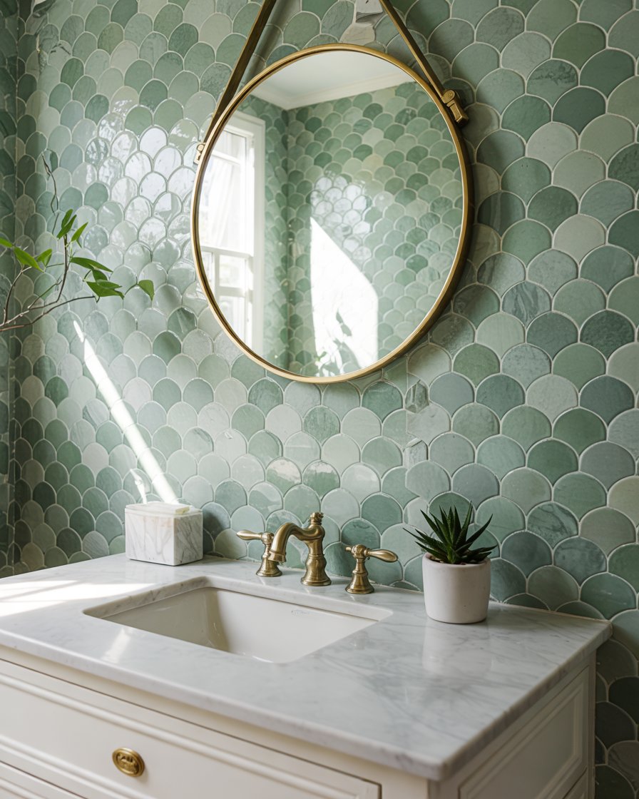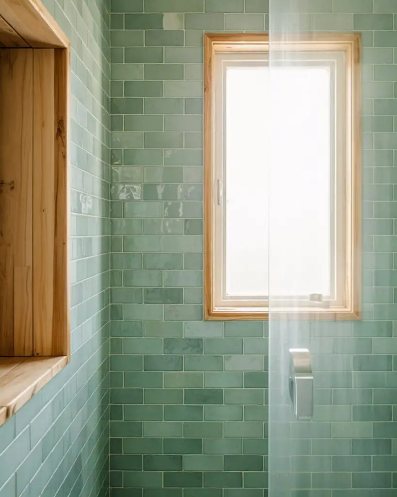 This idea works best in homes with good natural light or in bathrooms that already have a lot of white to balance the color. Green can feel heavy if overused, so many designers recommend using it on just one or two walls and keeping the rest of the space neutral. It’s also a color that pairs surprisingly well with warm metals like brass or copper, which can add a layer of sophistication without competing with the tile.
