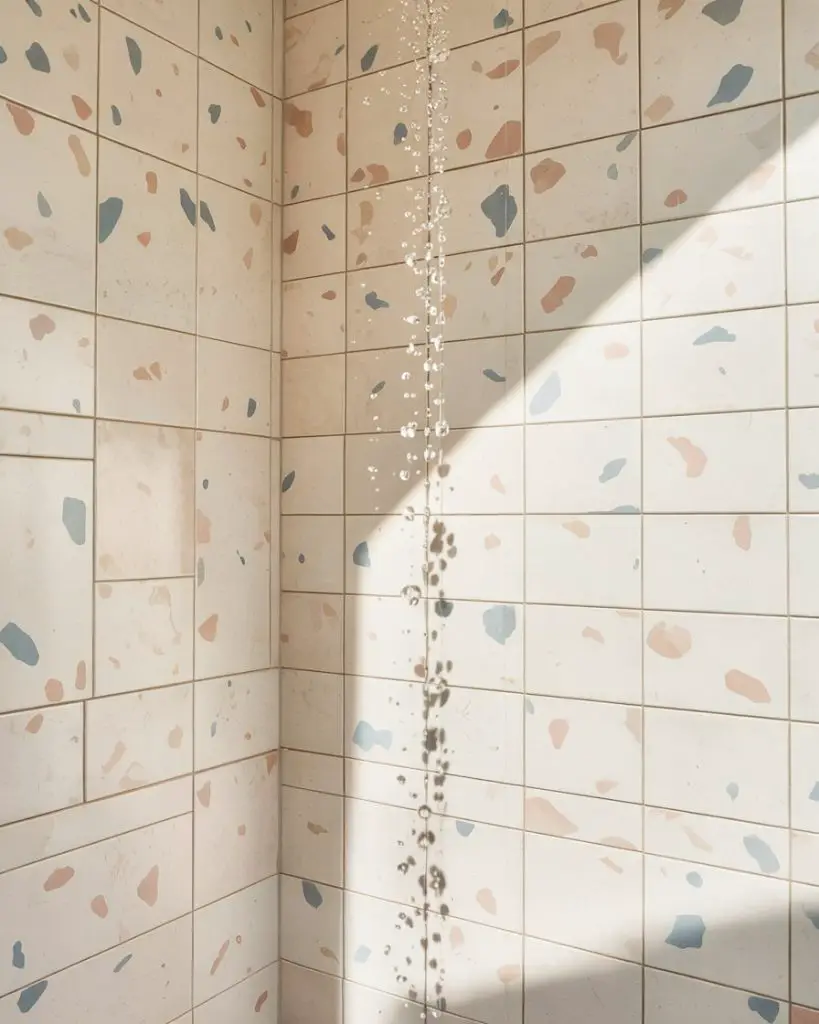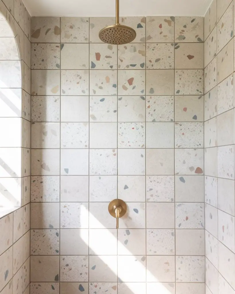Terrazzo is surprisingly practical—it’s durable, easy to clean, and hides minor stains or soap residue thanks to its busy pattern. It’s also a nod to mid-century design, which makes it feel both nostalgic and current. Use it on the shower floor or as an accent wall, and pair it with simpler, solid tiles to let the terrazzo be the focal point without overwhelming the space.