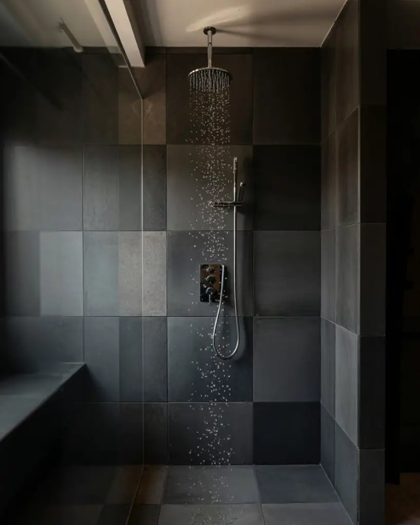 Dark tile creates a cocoon-like, intimate atmosphere that’s perfect for a primary bathroom or spa-inspired retreat. Charcoal, deep navy, or even black tiles in matte or textured finishes make a bold statement in 2026. This look works especially well in stand up showers with good lighting—think recessed LEDs or a statement pendant—so the space doesn’t feel too closed-in.