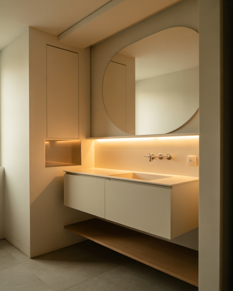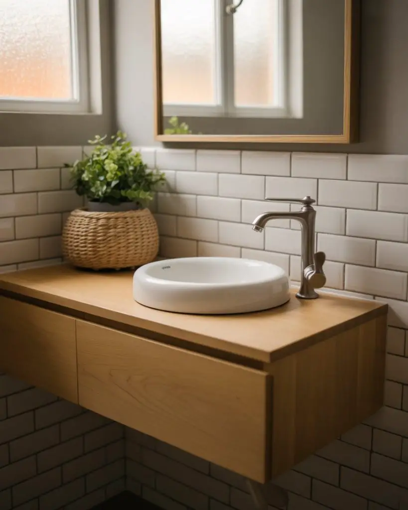 Wall-mounted vanities create the optical illusion of more floor space by revealing the full footprint of the room. This modern small bathroom design staple allows for easier cleaning underneath while making the room feel less furniture-heavy. The floating effect works especially well when paired with under-cabinet lighting, which creates a soft glow and emphasizes the hovering quality. Even in a 5-foot-wide bathroom, this single choice can make the space feel dramatically more open.