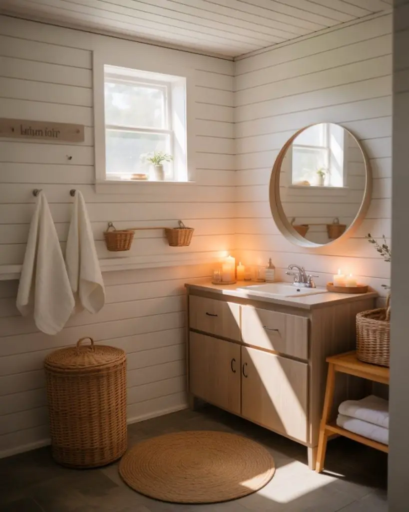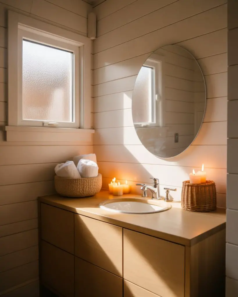 Nordic-inspired design brings a different energy than Japandi—it’s warmer, cozier, and more playful with texture. Think white walls paired with natural blonde wood, woven baskets, chunky knit bath mats, and candles clustered on floating shelves. This aesthetic feels particularly at home in colder climates where the bathroom becomes a refuge from harsh winters. The simple modern approach doesn’t sacrifice comfort for style; instead, it finds beauty in everyday functional objects arranged thoughtfully.