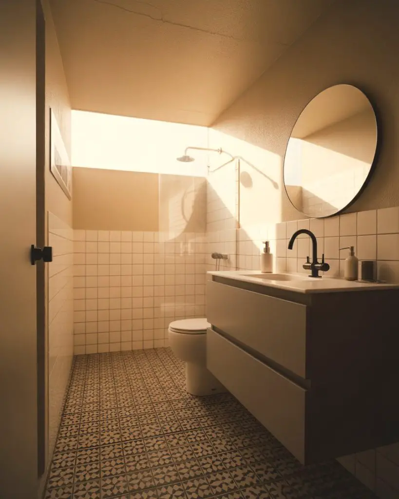 Bold floor tiles are having a resurgence in 2026, with geometric patterns, encaustic-look cement tiles, and colorful mosaics anchoring small bathroom designs. When walls are kept simple, a patterned floor becomes the room’s focal point without overwhelming the space. This approach works particularly well because the eye is drawn downward, which can actually make ceiling heights feel more dramatic. Designers are mixing traditional patterns with modern fixtures for a look that feels collected rather than cookie-cutter.