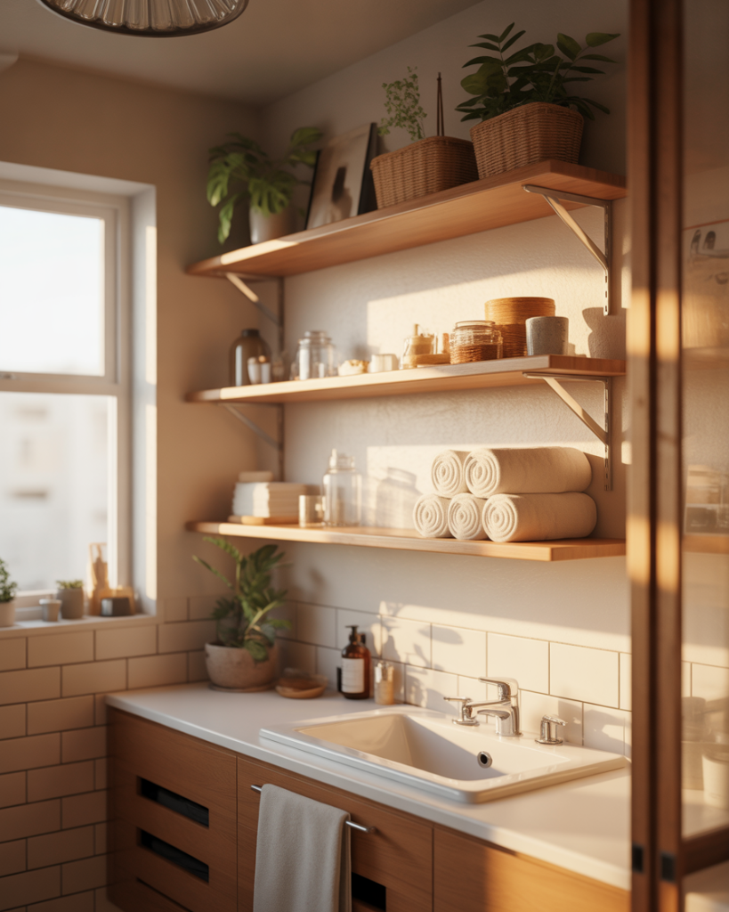 This works best in households where multiple people aren’t sharing the space, or where everyone commits to maintaining the aesthetic. A single professional living in a Seattle studio apartment uses open shelving successfully because she’s the only one accessing the space and enjoys the ritual of keeping things orderly. For families with kids, consider a hybrid approach—open shelving for pretty towels and plants, closed storage below the sink for everyday chaos. Budget-wise, this is one of the most affordable storage solutions: basic floating shelves cost $20-40 each, and you can DIY installation with basic tools and a level.