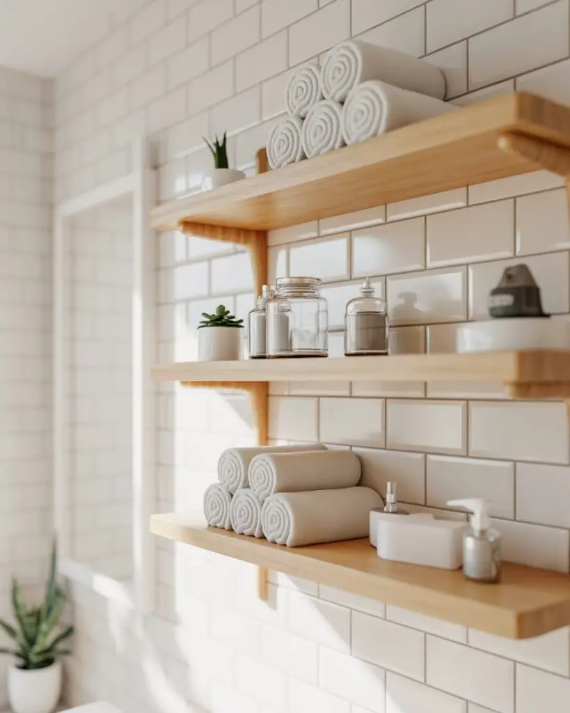 Replacing closed cabinets with open shelving creates an airy feeling that benefits small bathroom spaces. This 2026 trend requires a commitment to organization—everything on display must be intentional and attractive—but the payoff is a room that feels less boxy and more breathable. Floating wood shelves, glass ledges, or even repurposed vintage brackets holding reclaimed wood create storage that doubles as decor. The key is editing ruthlessly; if you wouldn’t want guests to see it, it doesn’t belong on open shelving.