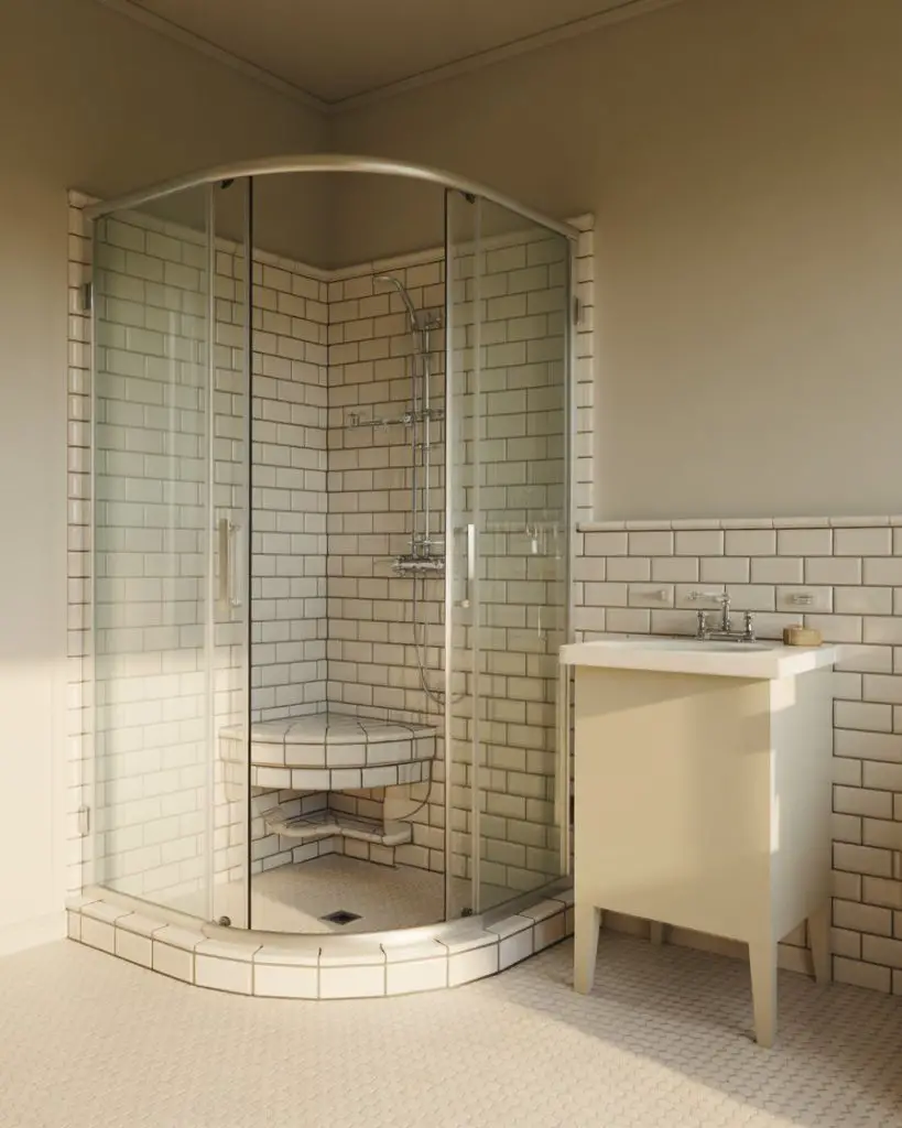 Corner showers maximize space saving potential by tucking into the most underutilized part of the room. Modern curved glass enclosures or neo-angle designs create functional shower spaces without the visual weight of traditional square enclosures. This layout frees up wall space for vanities or storage while maintaining comfortable shower dimensions. Paired with a corner bench and recessed shelving, these showers prove that small doesn’t mean compromising on comfort.