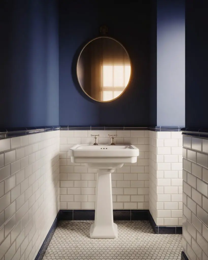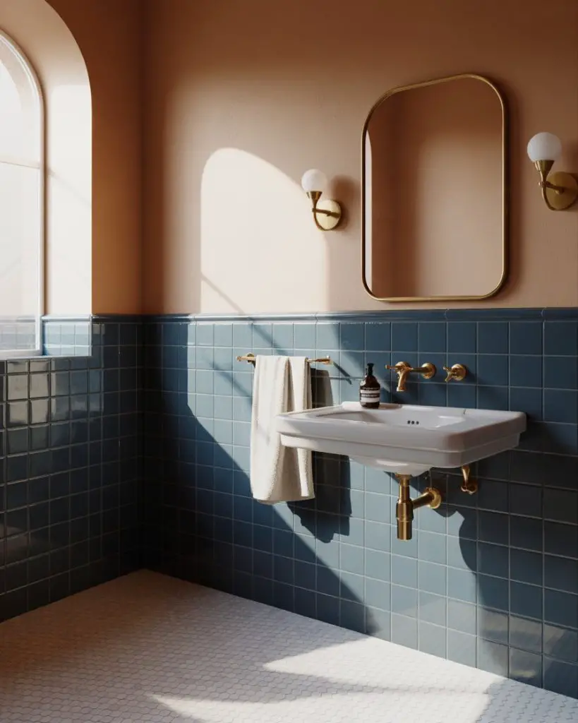 American lifestyle context matters here—this look has been embraced particularly in coastal regions from Maine to California, where the nautical color combinations feel at home. In the Midwest and South, warmer two-tone combinations like sage green and cream are gaining traction. Budget-wise, paint is the most affordable way to achieve this look, but tile creates a more permanent and moisture-resistant solution in high-splash areas. A common mistake is placing the division line too high or too low; designers typically recommend 32-36 inches from the floor, roughly one-third of the wall height in standard-ceiling bathrooms.