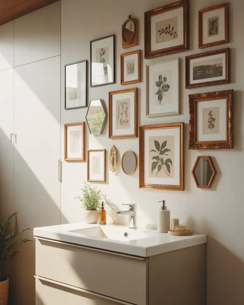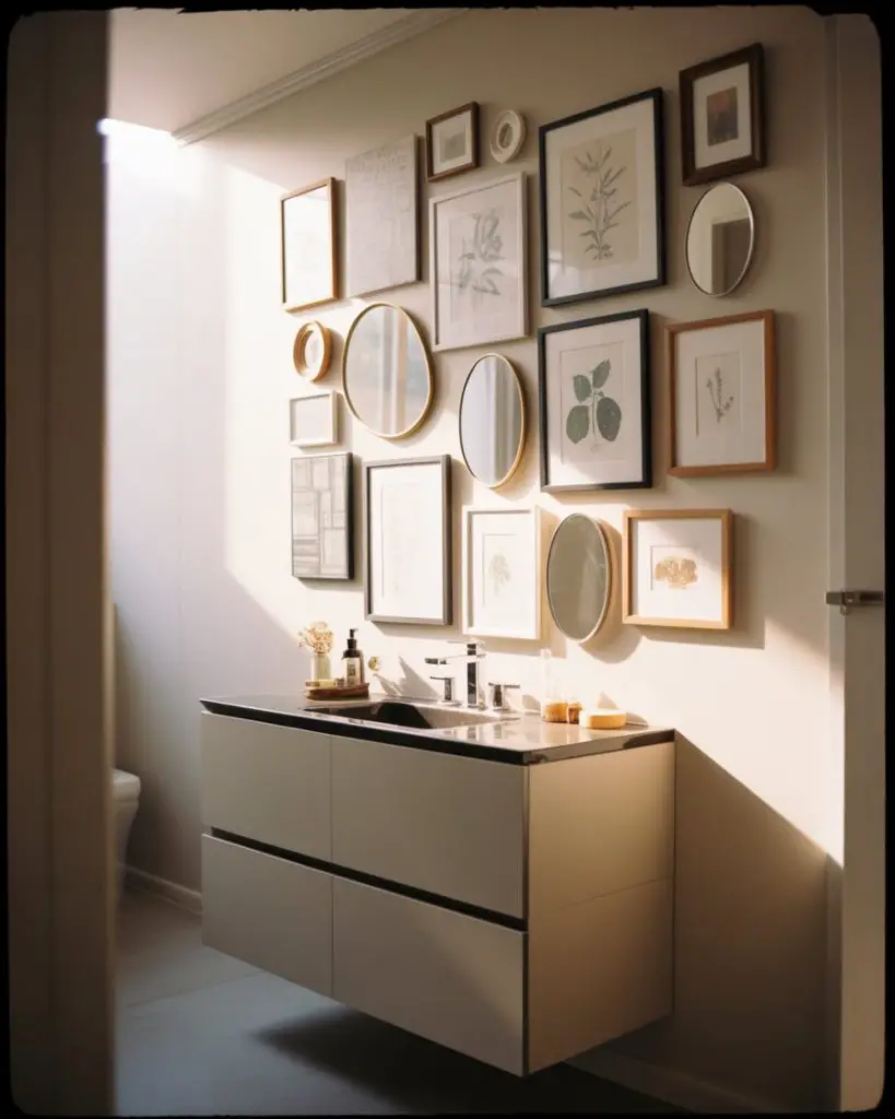 Don’t discount artwork in small bathrooms—a carefully curated gallery wall adds personality and visual height without taking up physical space. This ideas 2026 approach mixes framed prints, small mirrors, and even floating shelves with tiny objects into a cohesive display that reflects the homeowner’s style. The bathroom becomes more than a utilitarian space; it’s a room that tells a story. Choose moisture-resistant frames and artwork, and position the gallery on a wall away from direct shower spray.