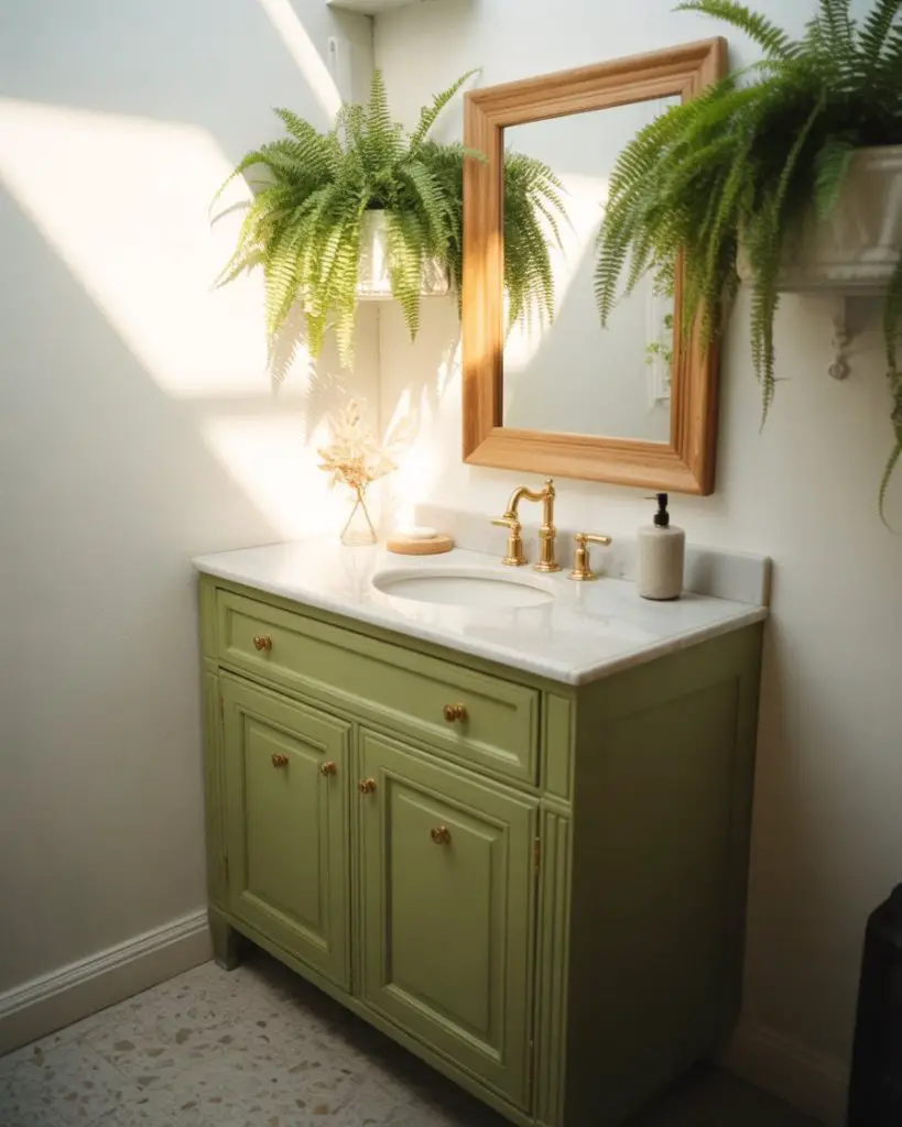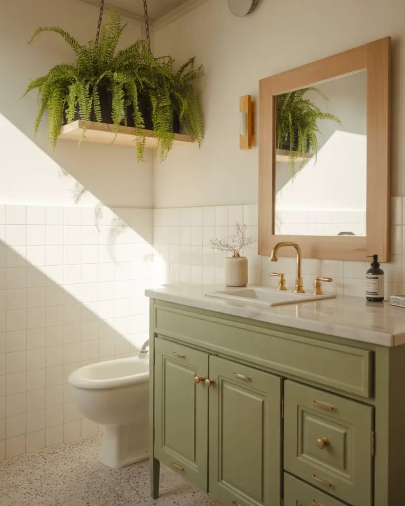 Bringing nature indoors through green elements has evolved beyond a simple potted plant—it’s now a core design principle for 2026. Biophilic bathrooms incorporate living walls, moss bath mats, sage-colored cabinetry, and even preserved greenery in acrylic frames. The psychology behind this trend is solid: studies show that natural elements reduce stress and improve mood, which is exactly what you want in a morning or evening routine. Even in a bathroom with no windows, strategic greenery and green tones can create an unexpectedly fresh atmosphere.