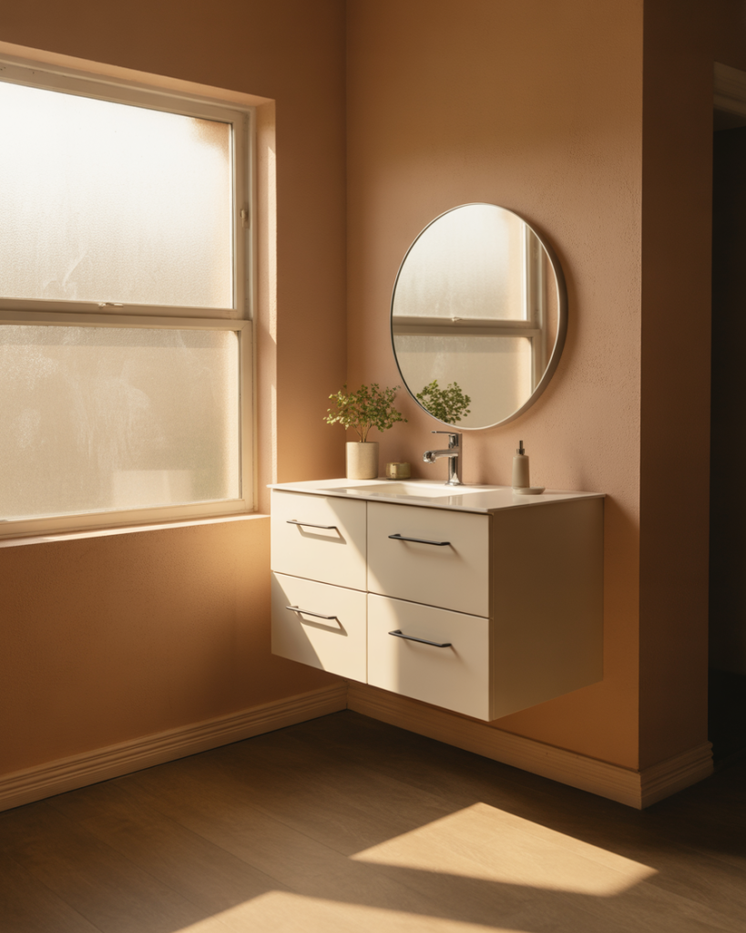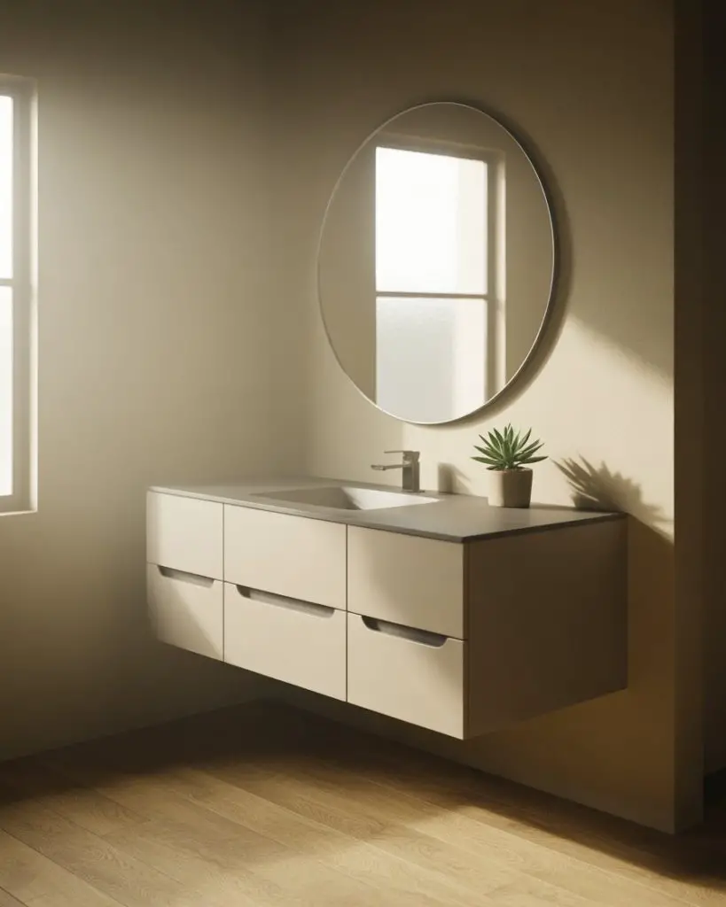 A wall-mounted vanity instantly creates the illusion of more floor space while offering extra storage where you need it most. Choose a simple design with soft-close drawers that tuck away toiletries, hair tools, and cleaning supplies without visual clutter. The gap beneath the vanity allows light to flow underneath, making even the smallest bathroom feel airier and more open. Pair it with a shallow basin to maximize counter space for your morning routine.