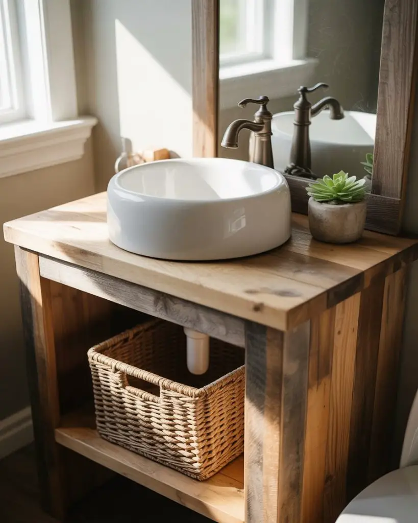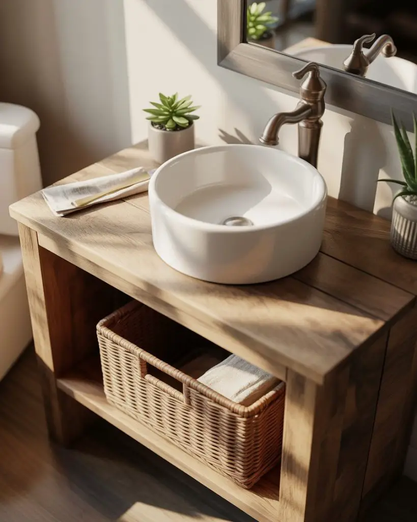 A rustic wood vanity—whether reclaimed barn wood or new lumber with a distressed finish—brings warmth and texture to a small bathroom that might otherwise feel sterile. Top it with a vessel sink in white ceramic or hammered copper to add a focal point without taking up counter space. Open shelving below keeps the look airy, and the wood grain introduces natural variation that makes the room feel lived-in and inviting. This works beautifully in farmhouse, bohemian, or eclectic homes.