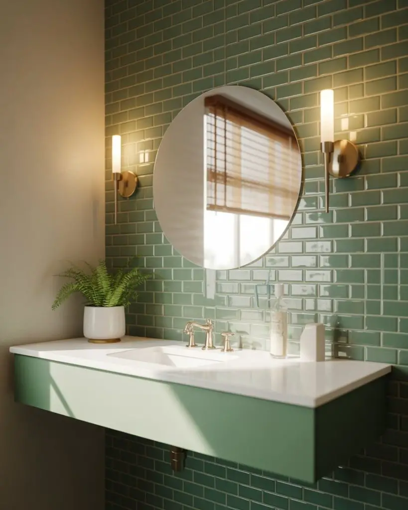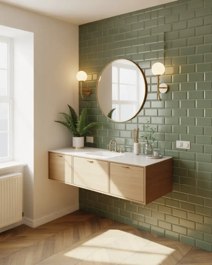A vertical strip or half-wall of green tile—sage, forest, or emerald—creates a striking focal point that grounds the space without overwhelming it. Use it behind the vanity or in the shower, and pair it with white or light wood tones to keep the palette balanced. Green connects to nature and promotes calm, making it a smart choice for a room where you start and end your day. The color also photographs beautifully, which is why it dominates Pinterest boards right now.