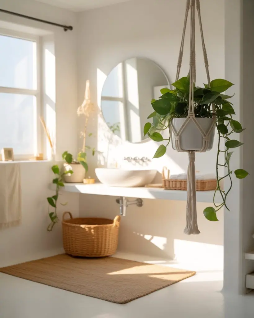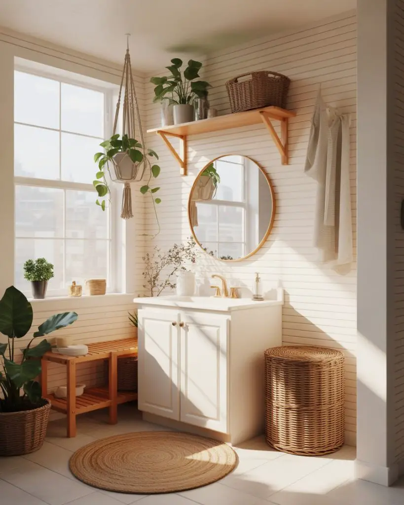 Layering bohemian textiles—a jute rug, macramé wall hanging, or woven basket—adds warmth and personality to a small bathroom without permanent changes. Pair these with potted plants like pothos, snake plants, or ferns that thrive in humid conditions. The mix of natural fibers and greenery softens hard surfaces and makes the space feel collected and intentional rather than sterile. This approach works beautifully in rentals or homes where you’re not ready for a full remodel.