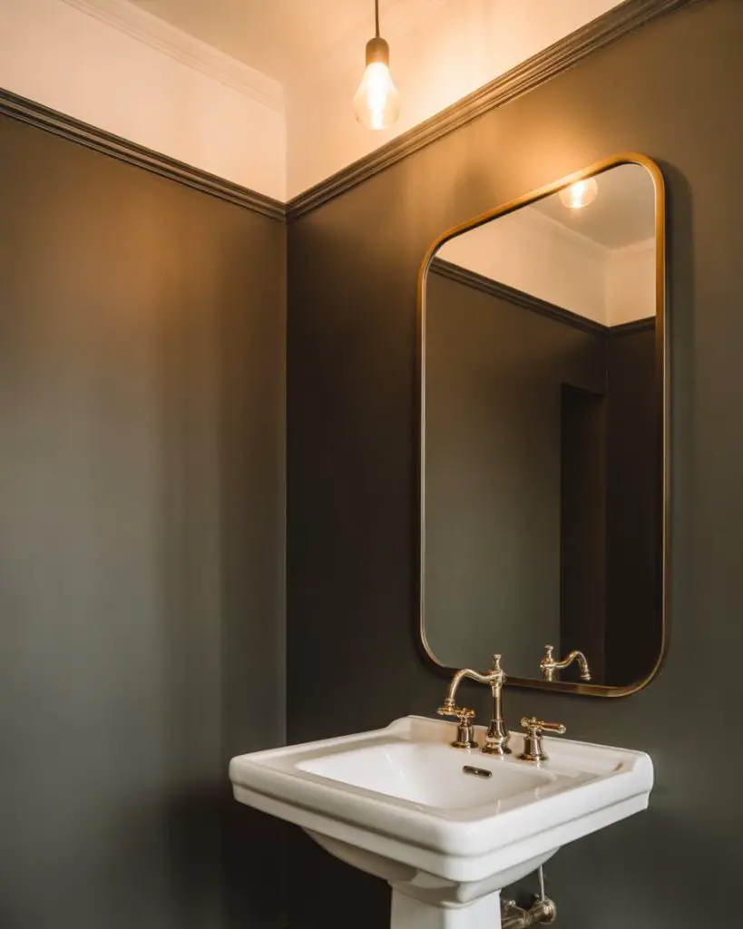 Painting walls in dark charcoal, navy, or forest green might seem counterintuitive in a small bathroom, but the drama actually makes the space feel intentional and cozy rather than cramped. Pair it with brass or gold fixtures, mirrors, and lighting to reflect light and add warmth. Keep the ceiling white to maintain a sense of height, and use ample lighting to prevent the room from feeling cave-like. This bold move pays off in style and sophistication.
