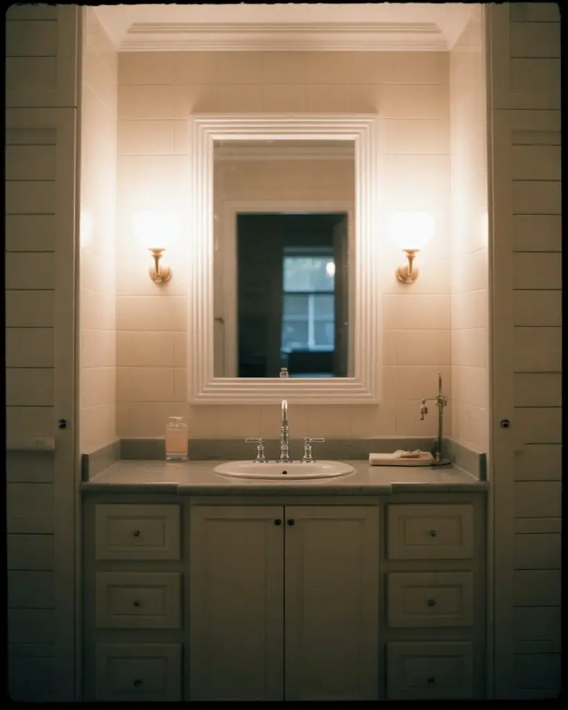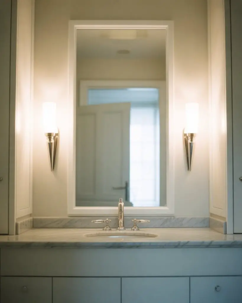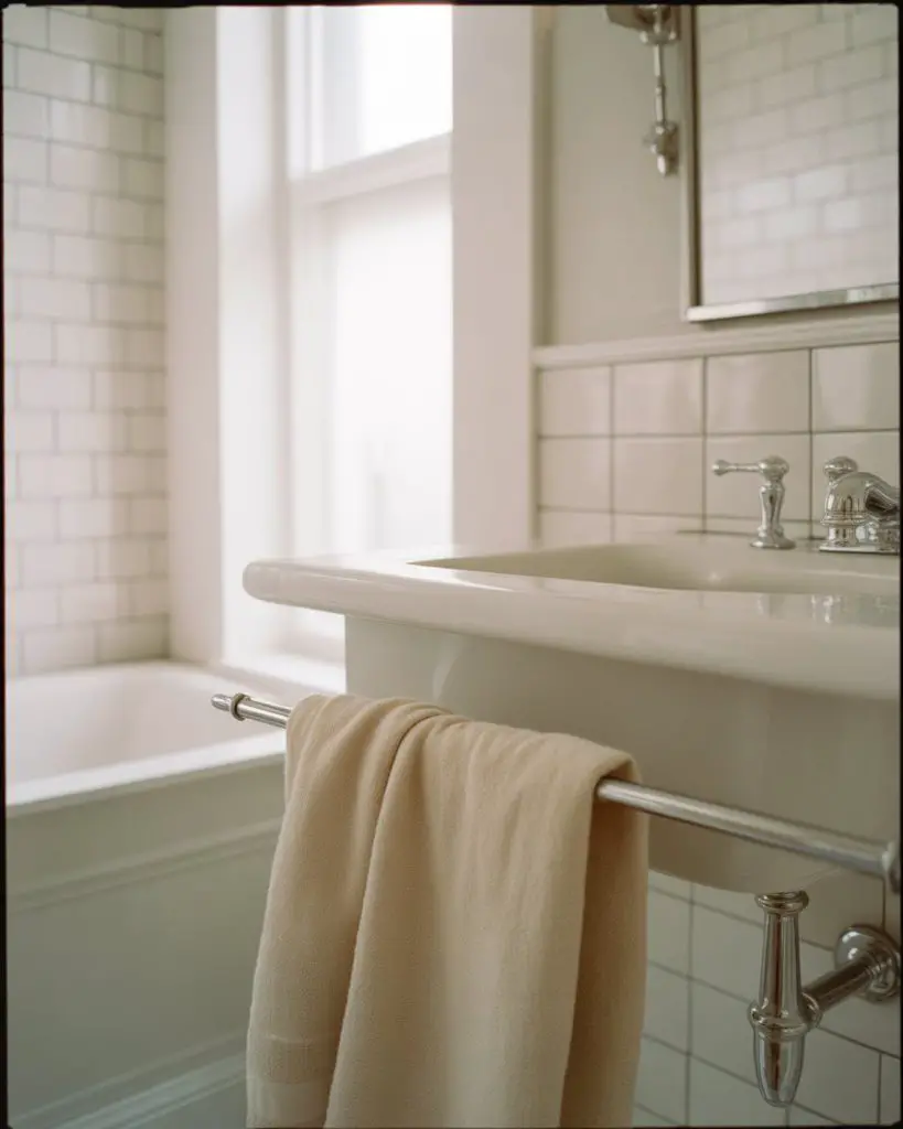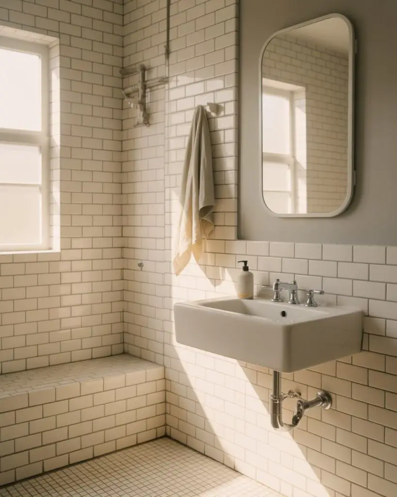 This works best for people who genuinely prefer minimalism and won’t leave makeup, hair products, or laundry piled on the counter. A real estate agent in California told me that all-white bathrooms photograph incredibly well and appeal to the broadest range of buyers, which makes them a safe bet if you’re planning to sell within a few years. The downside is that every smudge and water spot shows, so you’ll be wiping down surfaces more often.