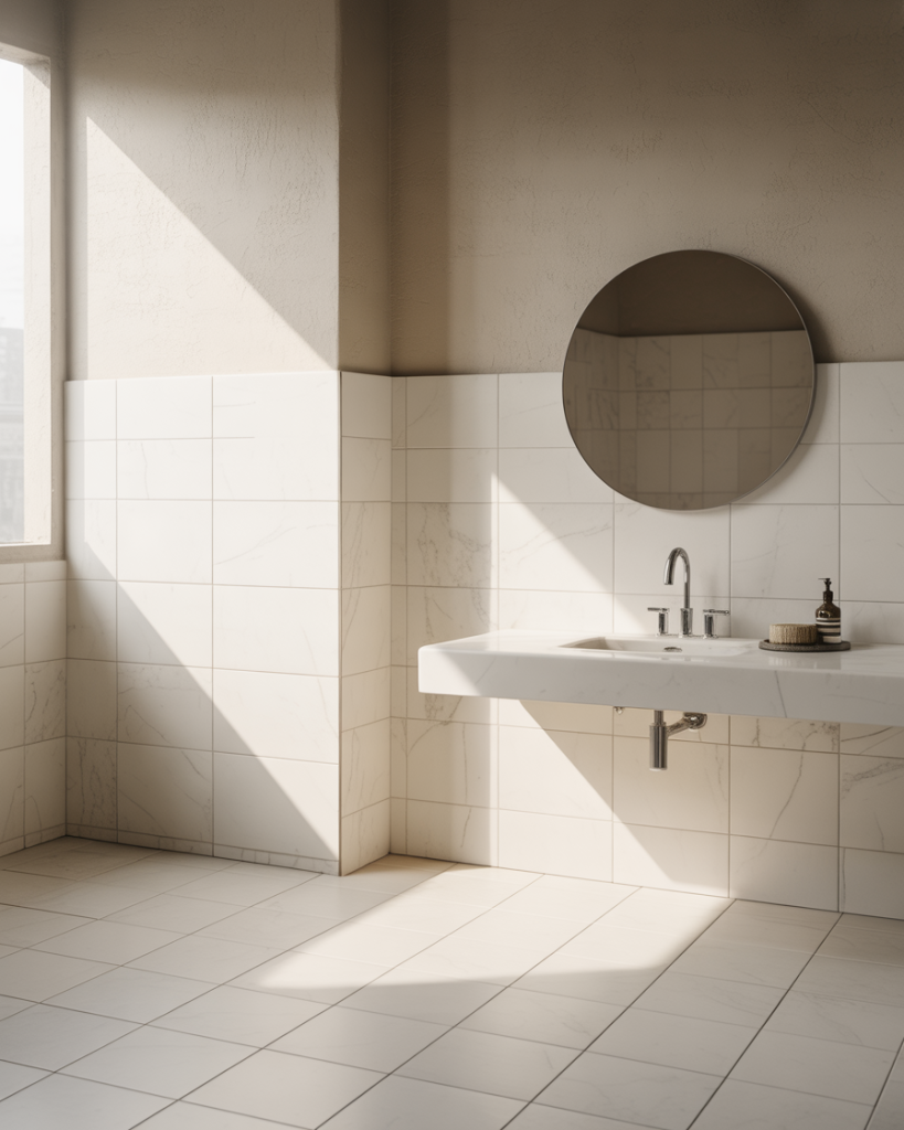 This has become a go-to for bathroom renovations across the country because it delivers the “expensive” look at a fraction of the price—you’ll spend $4–$8 per square foot versus $15–$25 for real marble. The large-format tiles (12×24 or bigger) also install faster and create fewer grout lines, which means less cleaning and a more seamless appearance. Just make sure your installer is experienced with large-format tile to avoid lippage issues.