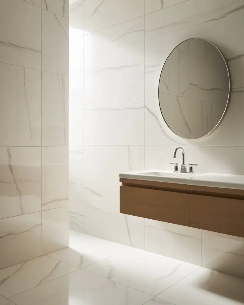 Choosing elegant marble-look porcelain tile gives you the luxury aesthetic of real stone without the maintenance headaches or cost. These tiles are waterproof, stain-resistant, and come in large formats that reduce grout lines and make the space feel more expansive. Use them on floors and walls for a cohesive, high-end look, and pair them with simple fixtures that let the tile shine. The veining and depth create visual interest without pattern overload.