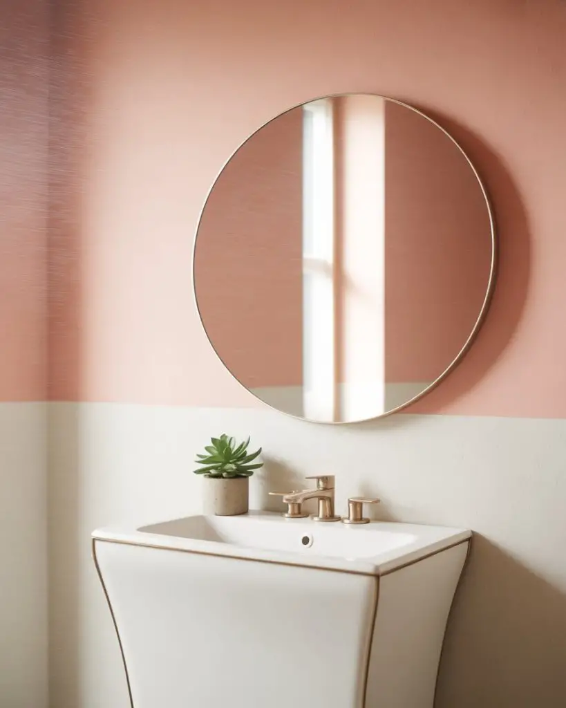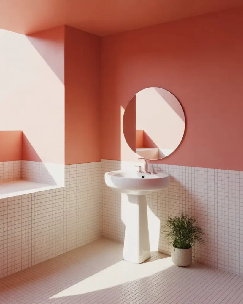 Inspired by the whimsical, color-blocked worlds of Toca Boca games, this approach uses bold geometric sections of color—think a pink lower half and white upper half, or a blue vanity against a yellow wall. It’s playful and unexpected, perfect for powder rooms or kids’ bathrooms where you can afford to take risks. The key is choosing colors that share an undertone (all warm or all cool) so the contrast feels intentional rather than chaotic.