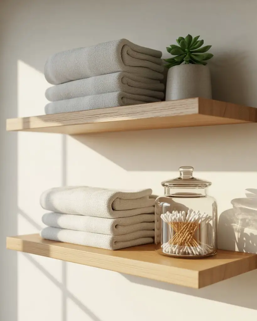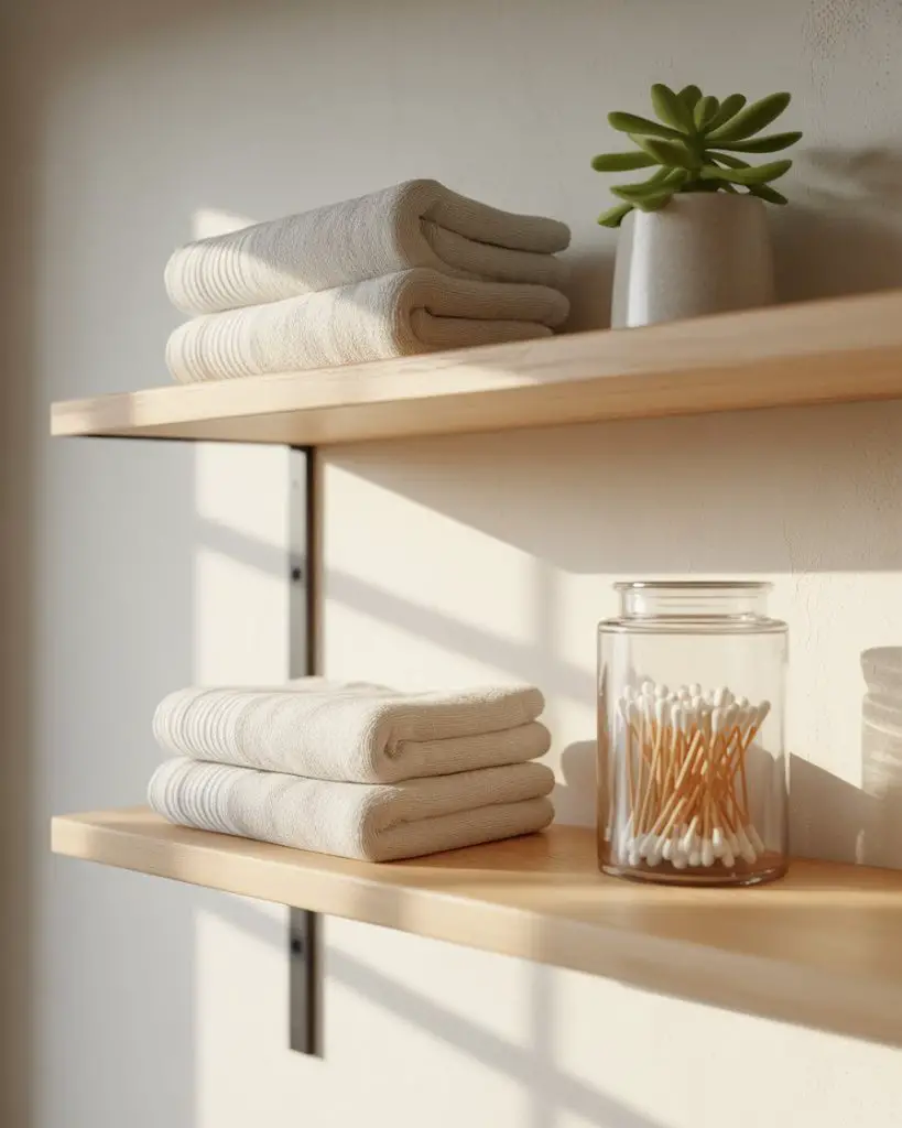 Installing simple floating shelves in natural wood or matte white adds storage and display space without the visual weight of traditional cabinetry. Keep the styling minimal—a few folded towels, a small plant, and maybe a candle—to avoid clutter. This approach is budget-friendly, DIY-able in an afternoon, and easily adjustable if your needs change. The clean lines and open design keep the room feeling light and unenclosed, which is crucial in a tight space.