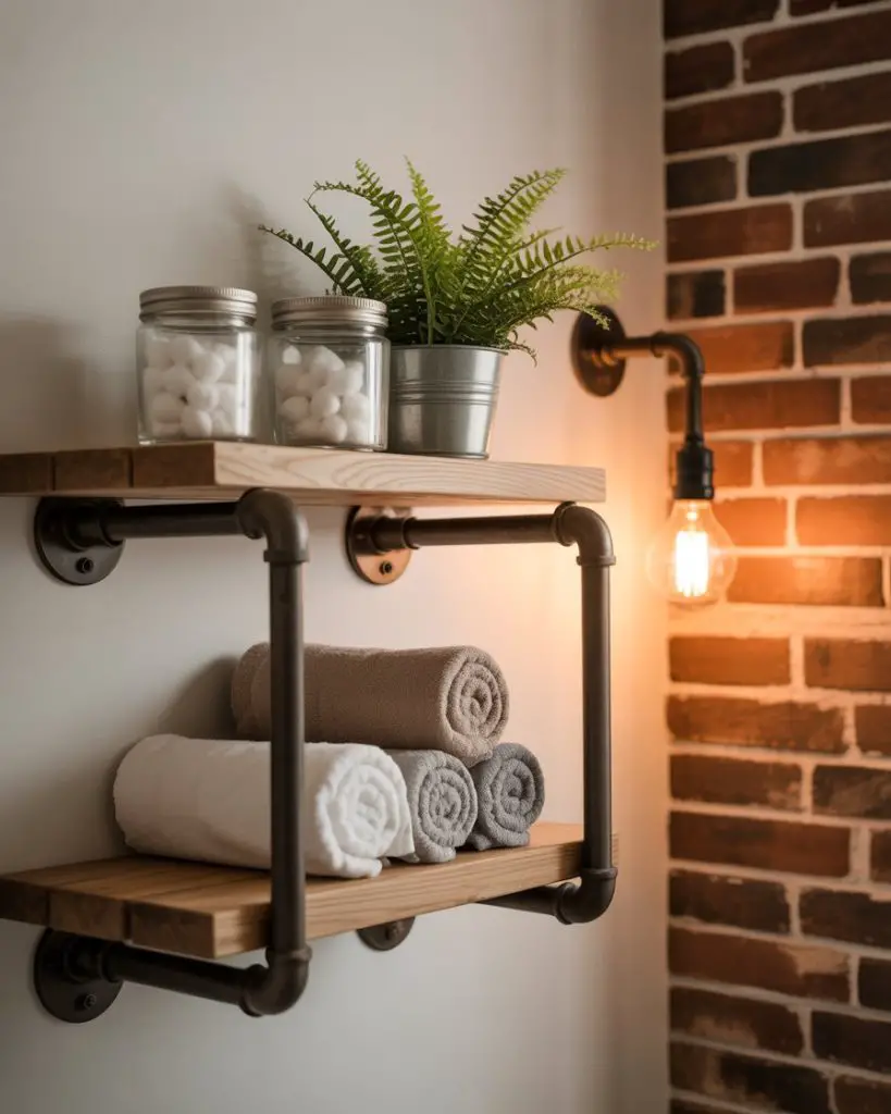 Black iron pipes and reclaimed wood planks create open shelving with an industrial edge that’s both functional and stylish. This DIY-friendly solution costs far less than built-in cabinetry and can be customized to fit any awkward nook or narrow wall. Stack folded towels, toiletries in matching jars, and a few small plants to keep the display organized and intentional. The raw materials add character without requiring a full renovation.