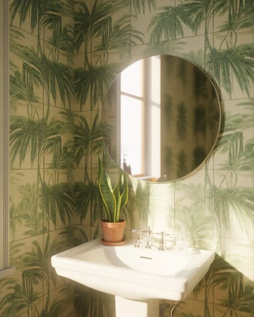 This works best in powder rooms or half baths where you can afford to be bold—spaces that guests use briefly but remember vividly. The pattern gives you permission to keep everything else understated, which actually makes the room feel larger. Budget around $8–$12 per square foot for quality porcelain tiles that can handle moisture and foot traffic over the years.