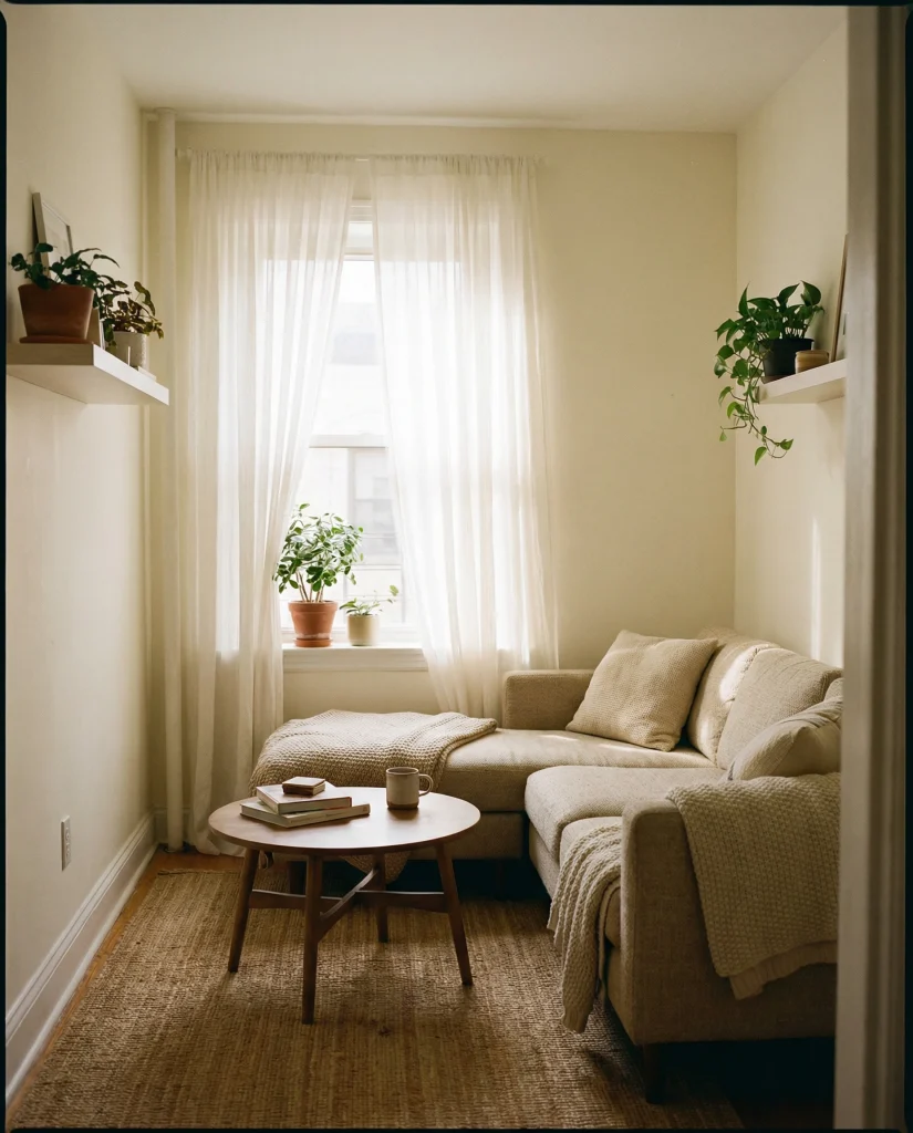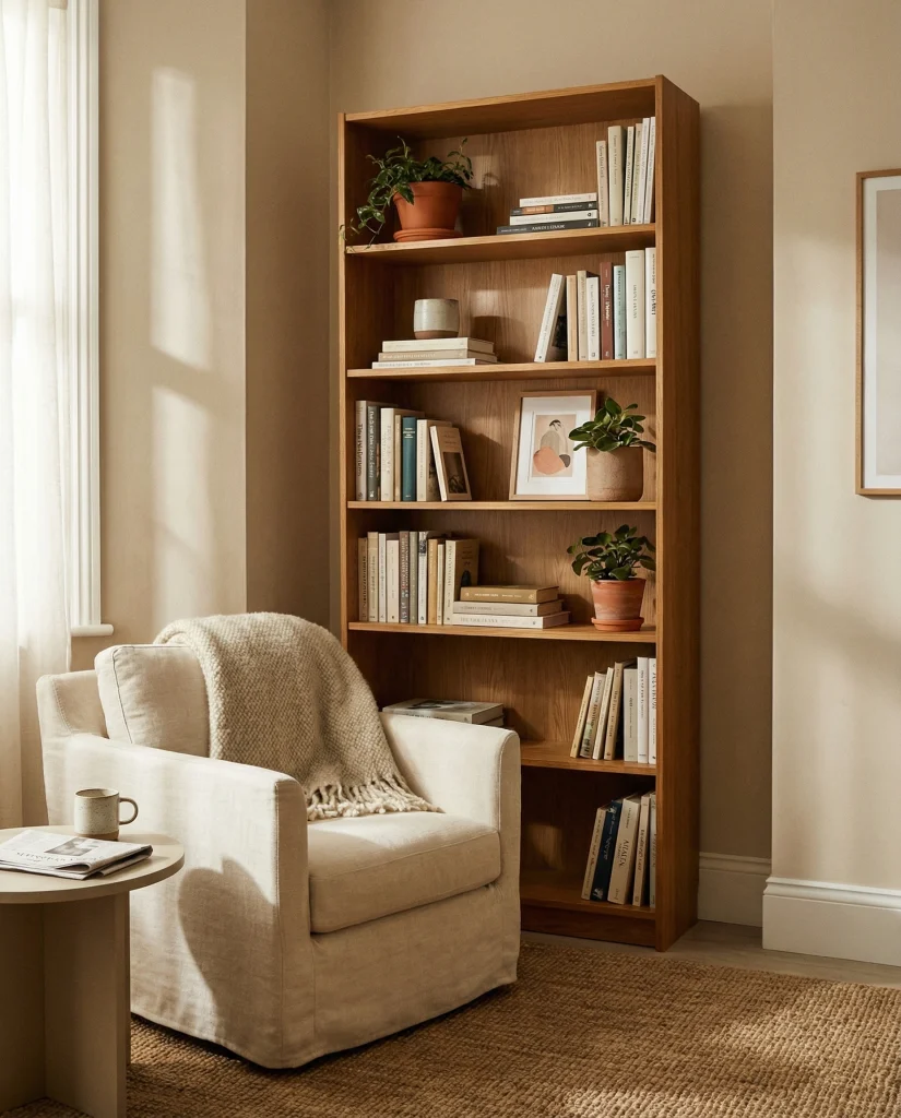 A simple corner can transform into a warm reading moment, especially in a compact apartment where every inch counts. Adding a slim shelf brings vertical interest and keeps the space light, pairing well with an apartment bookshelf setup or a soft, cozy apartment aesthetic. The idea works beautifully in rentals where major renovations aren’t possible.