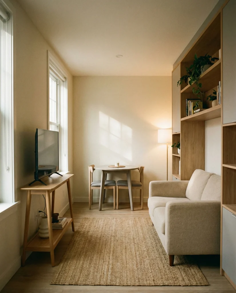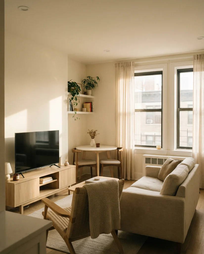 Common mistake to avoid: choosing heavy, boxy furniture that interrupts eye-level flow. Floating pieces maintain a clean line and help the room feel taller, especially in low-ceiling apartments.