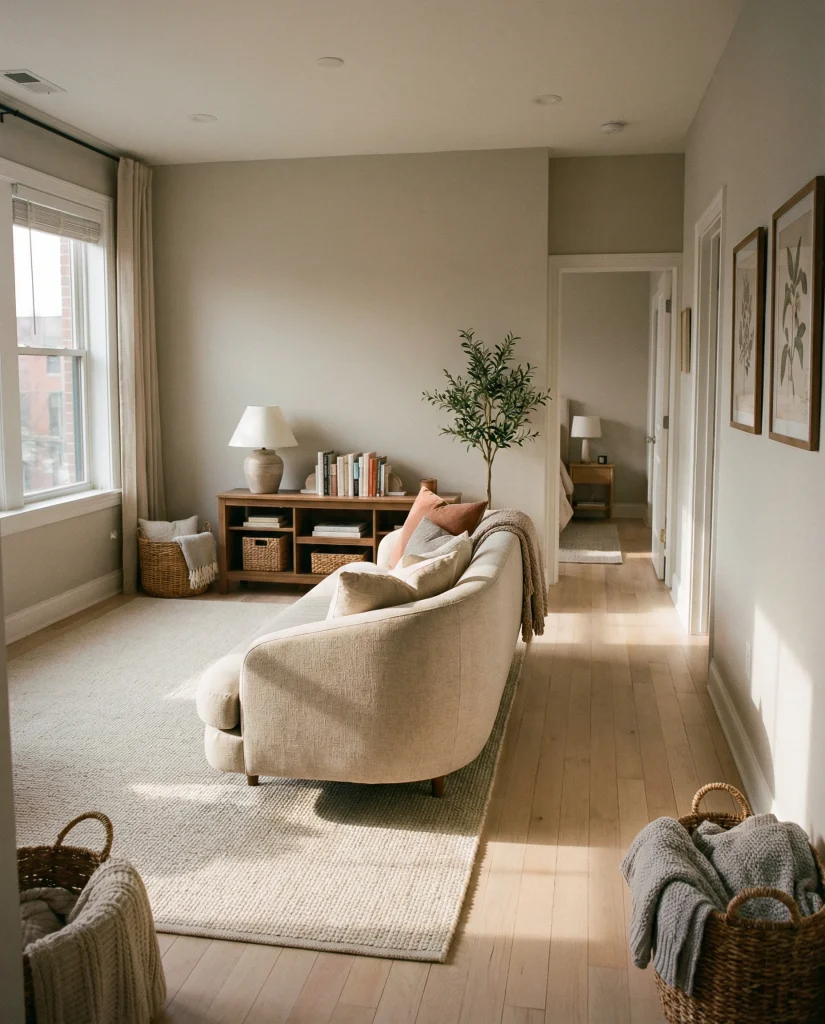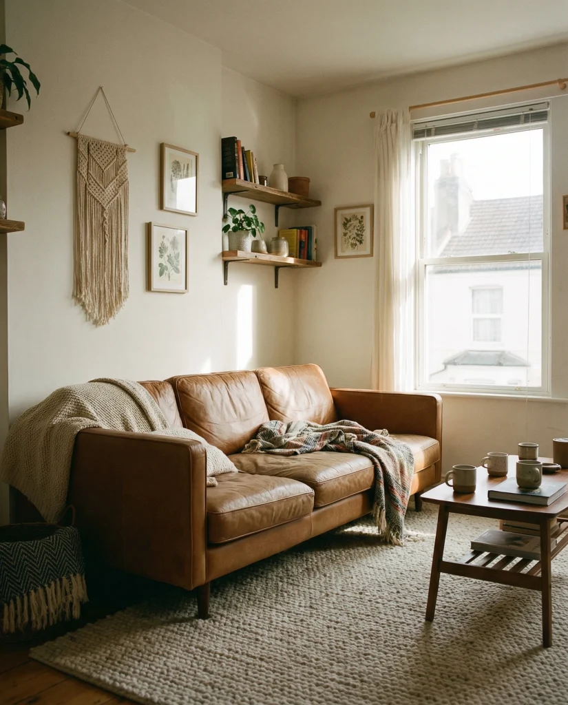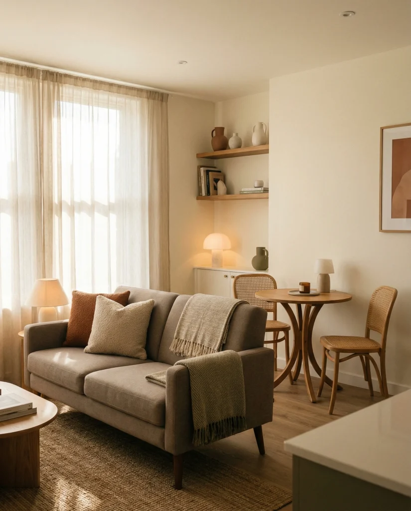 Mixing rustic textures with clean silhouettes gives depth to small spaces. Leaning into an apartment’s cozy boho modern style adds life without clutter. This works particularly well with subtle accents that mirror the apartment’s cozy aesthetic elements.