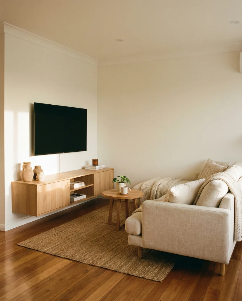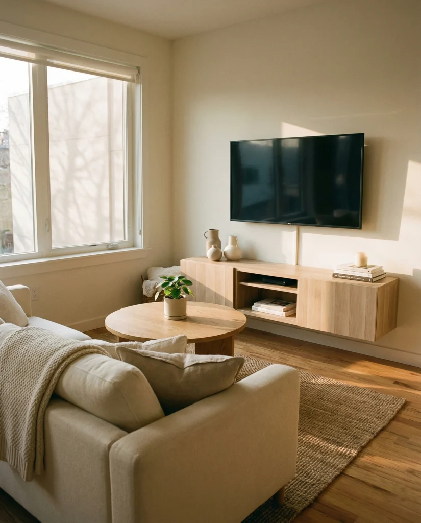 A slim floating console paired with a compact TV setup keeps the footprint light and functional, especially in very small apartments. This approach is ideal for renters building a cozy, modern apartment decor without bulky storage. Wall-mounted units preserve precious floor space.