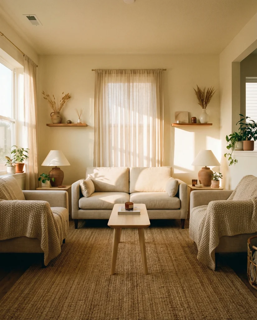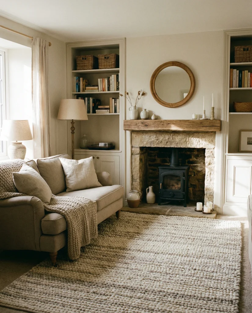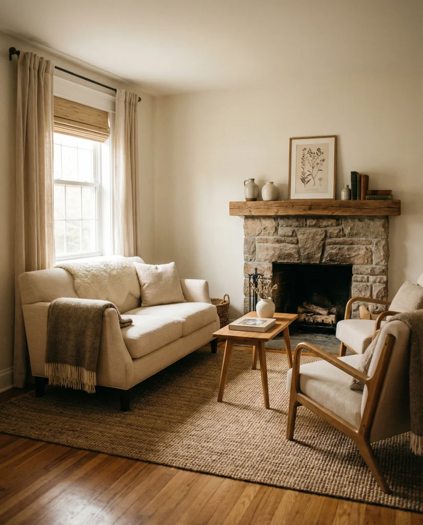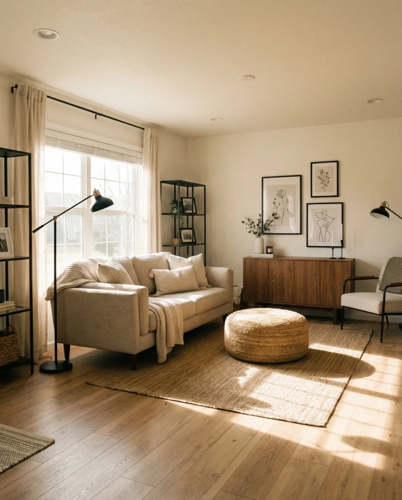 Budget angle: many rustic-modern pieces—woven baskets, linen pillows, light wood shelves—are inexpensive and widely available. Even a few tactile additions can shift the entire room’s mood.