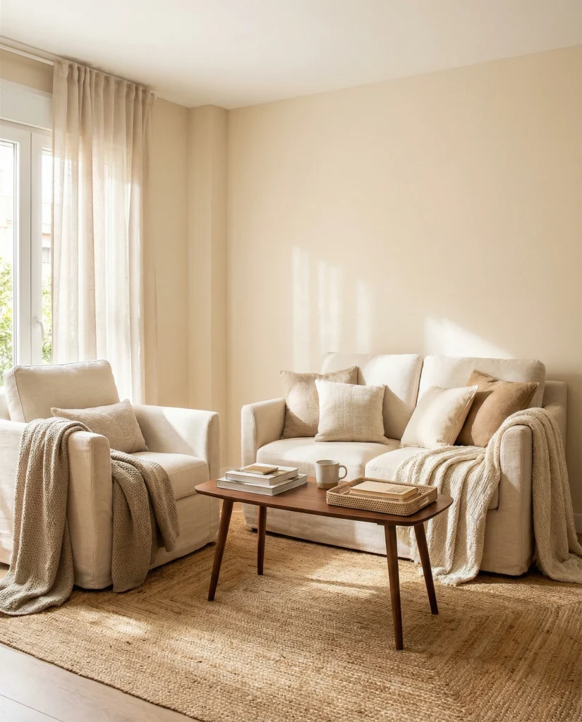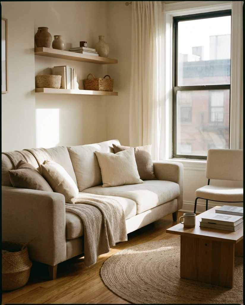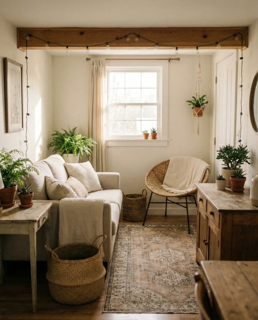 Mixing soft neutrals with artisan textures is a winning combo for an apartment with a cozy boho rustic style. Layered rugs, wicker accents, and a compact sofa give warmth without crowding. This look also plays well with an apartment couch and chair configuration when guests need additional seating.