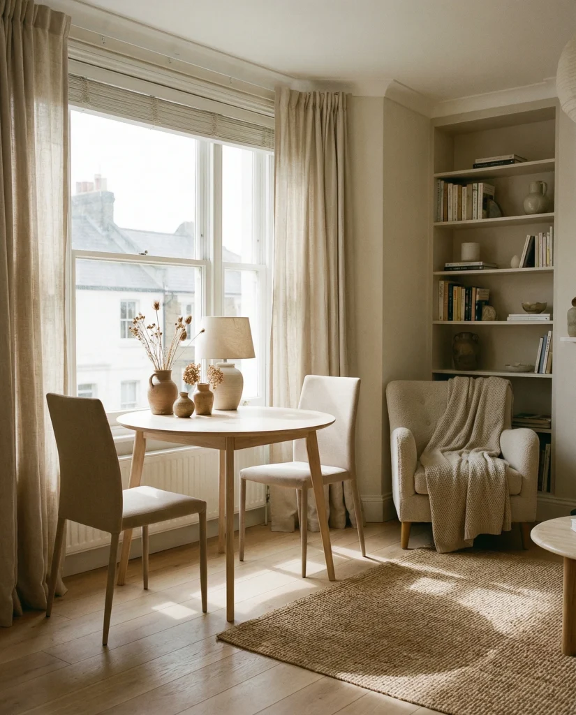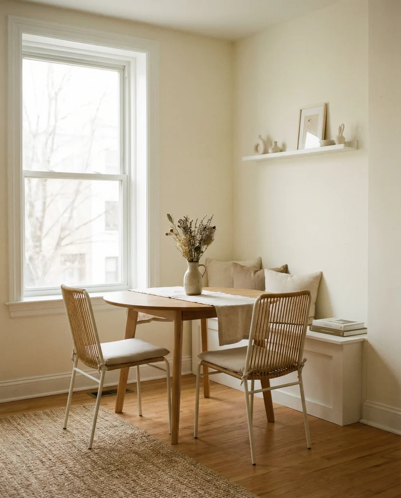 Many apartments benefit from placing a dining nook beneath a bright window, especially when working with modern cozy dining area layouts. This keeps the main zone open and complements setups using a dining area apartment table for daily meals or work-from-home moments.