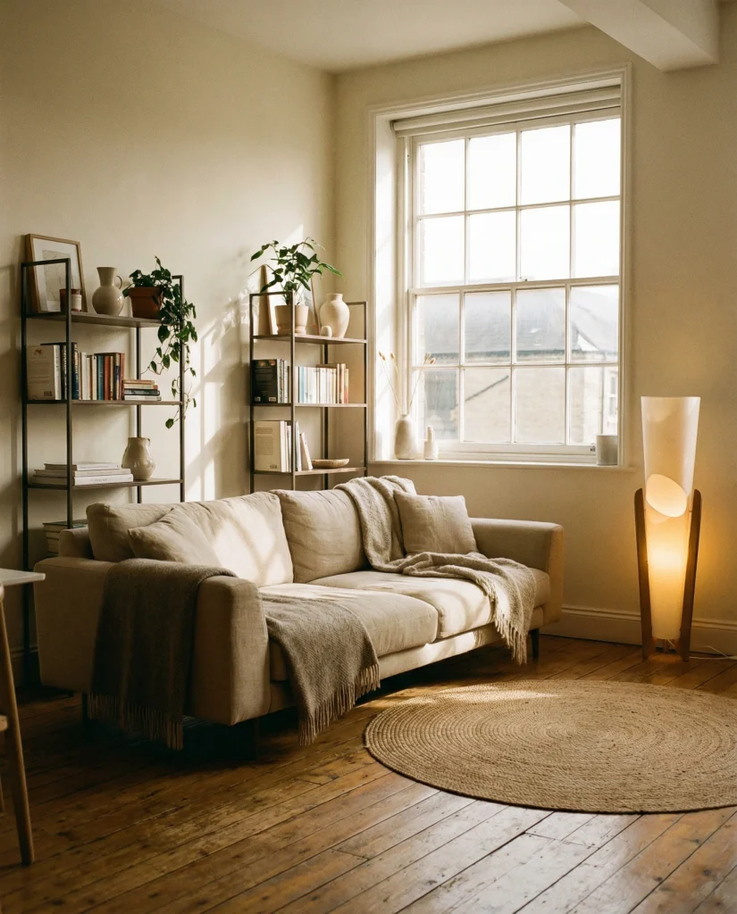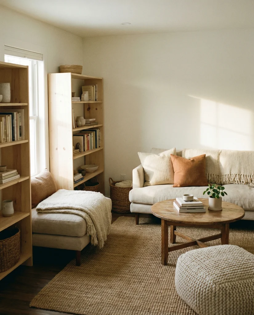 In many U.S. apartments, homeowners love using a single corner to carve out purpose. This layout works best when the main seating is pushed to one side so the books become an anchor instead of clutter. A small lamp and a tonal throw create the final cozy layer.