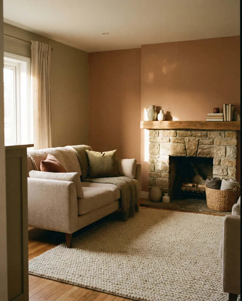 When the fireplace is central, placing the main sofa directly across from it creates a calm, anchored layout. This pairs well with apartment decor with a fireplace and can complement seasonal accents from Apartment Cozy. The focus remains warm and grounding.