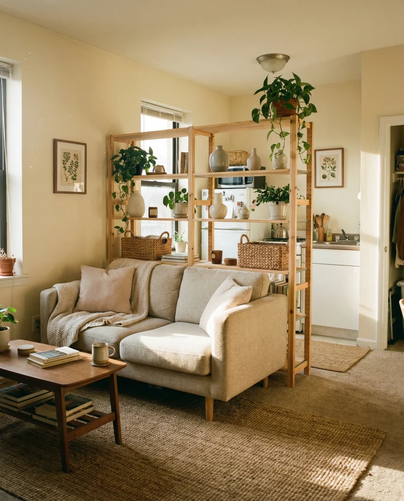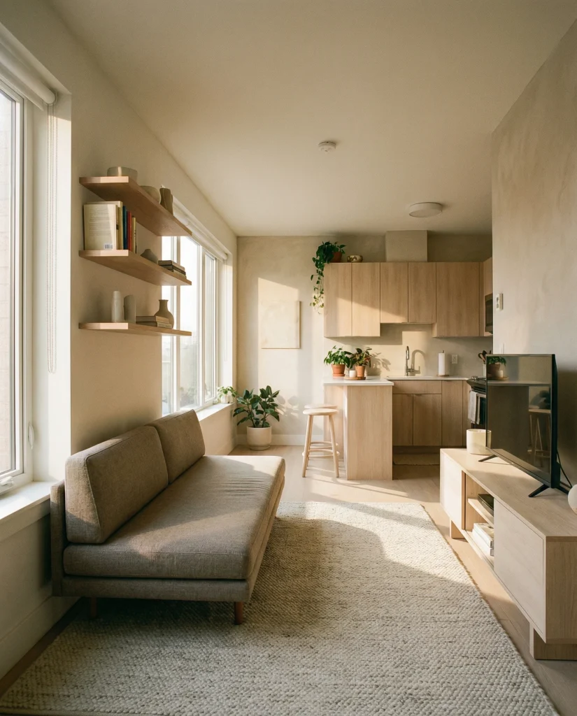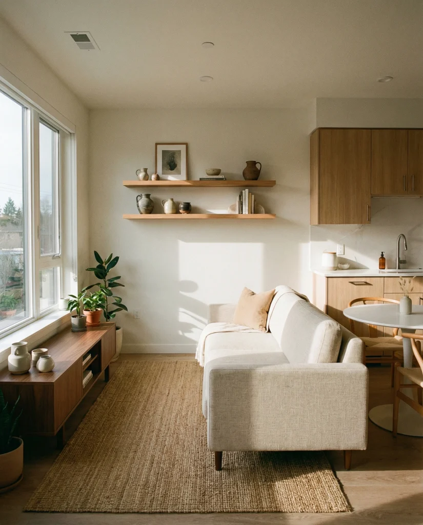 When a small living room blends into the kitchen, keeping everything light helps maintain flow. A soft rug, slim sofa, and floating shelves complement an open concept layout. The look also plays well with cozy apartment decor and modern accents that keep the space feeling intentional, not cluttered.