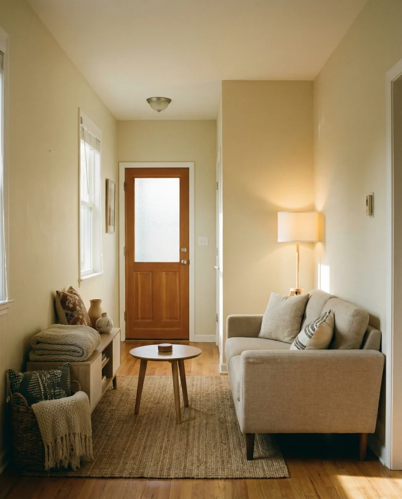 Placing the sofa across from the entry can help tighten the layout, especially in homes with a front door entrance in the middle. This works well in layouts built around an apartment’s cozy layout approach that prioritizes smooth, intuitive flow.