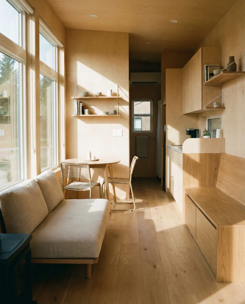 Where it works best: micro-apartments, renovated basements, or accessory dwelling units where living, dining, and lounging blend together. The layout feels intentional and helps avoid the guesswork of dividing a single room into too many zones.