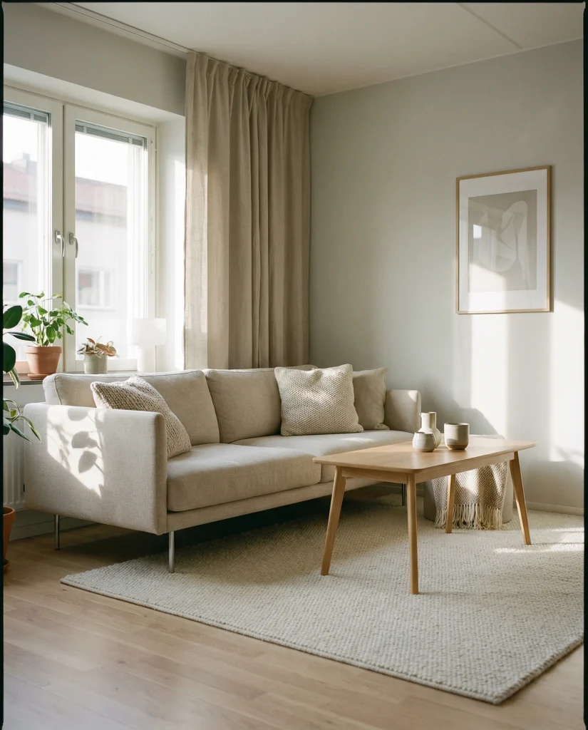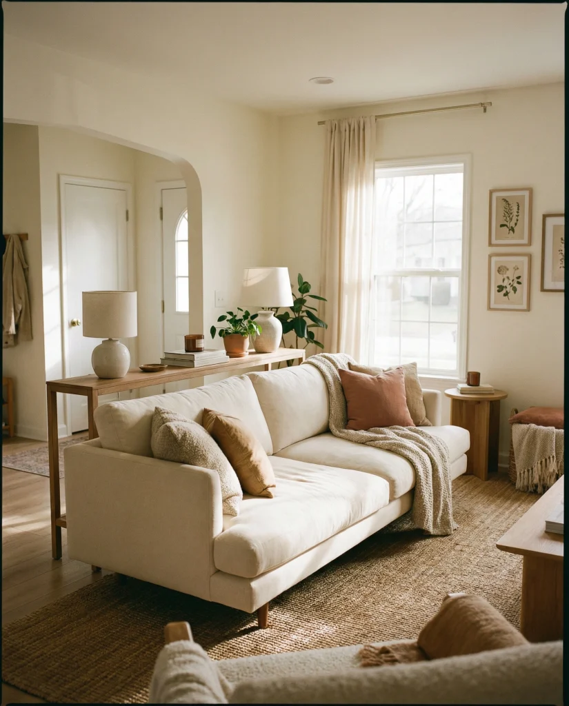 A practical insight: floating the couch just a few inches off the wall can make the room feel significantly larger. It also creates space for a slim console behind it, offering storage without overwhelming the layout.