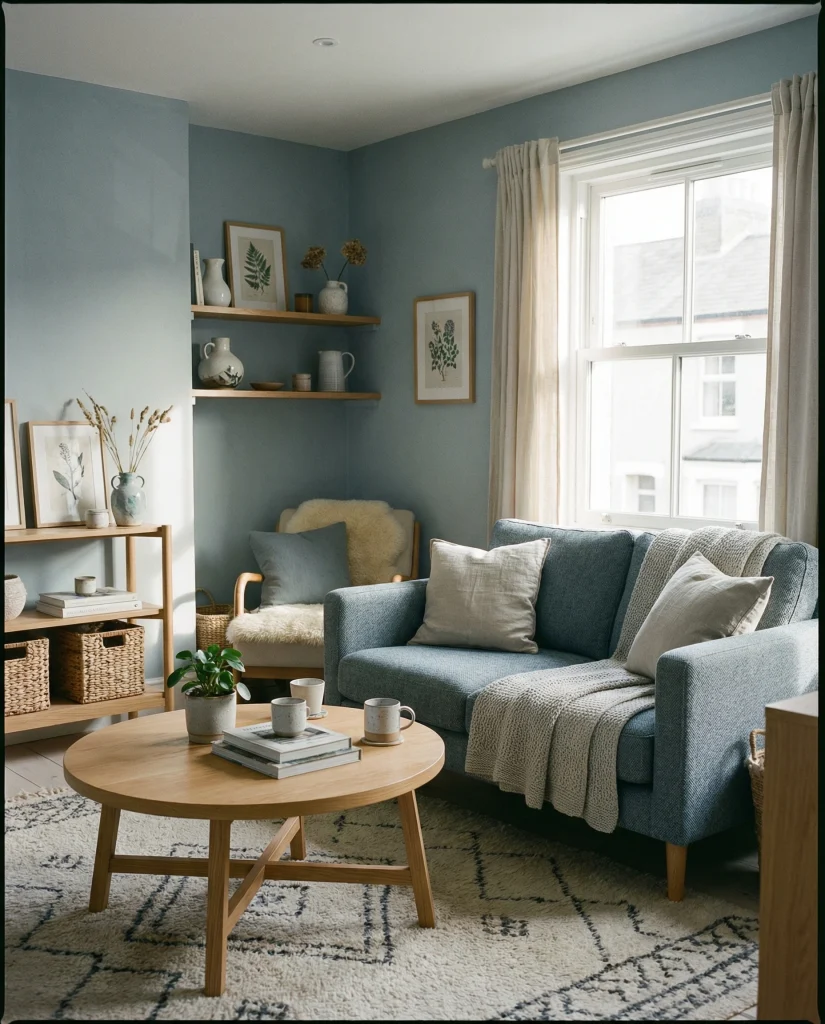 Budget angle: blue-gray paint is widely available at affordable prices in big-box stores, and even a single accent wall can shift the entire mood of a small space. Add textured pillows or woven baskets to prevent the palette from feeling flat.