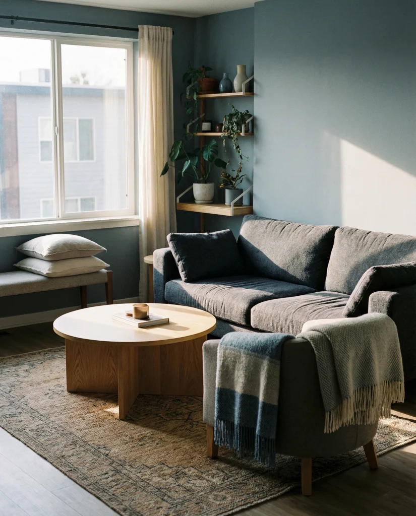 A soft wash of Apartment Cozy blue-gray instantly calms a compact layout, especially when paired with warm textures. This palette feels modern without leaning cold and works well for renters leaning toward a cozy apartment look. The color makes tight corners fade visually, creating subtle depth.