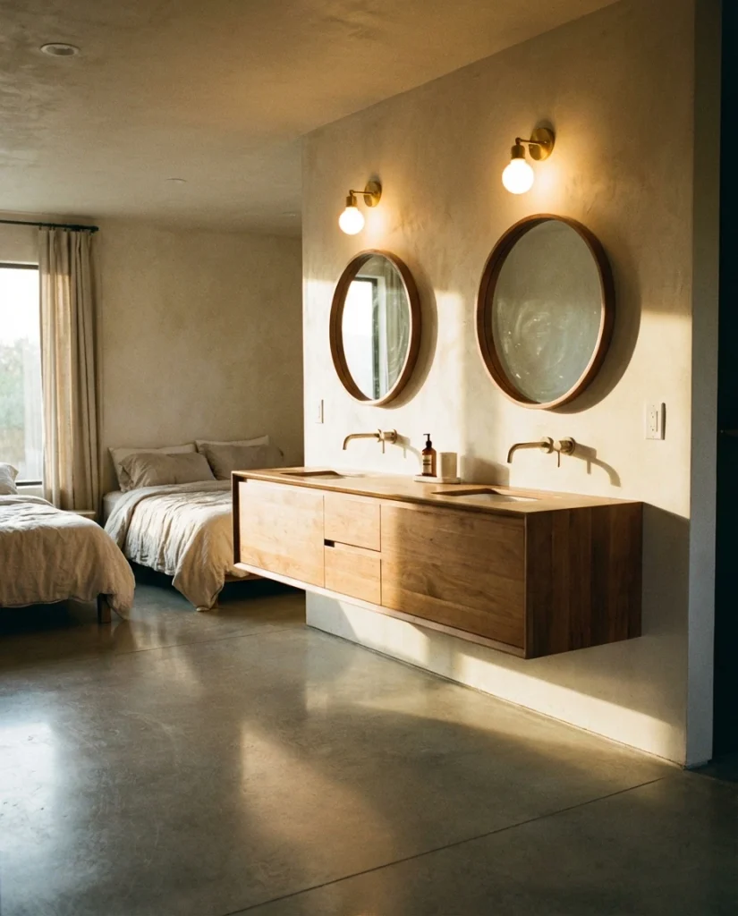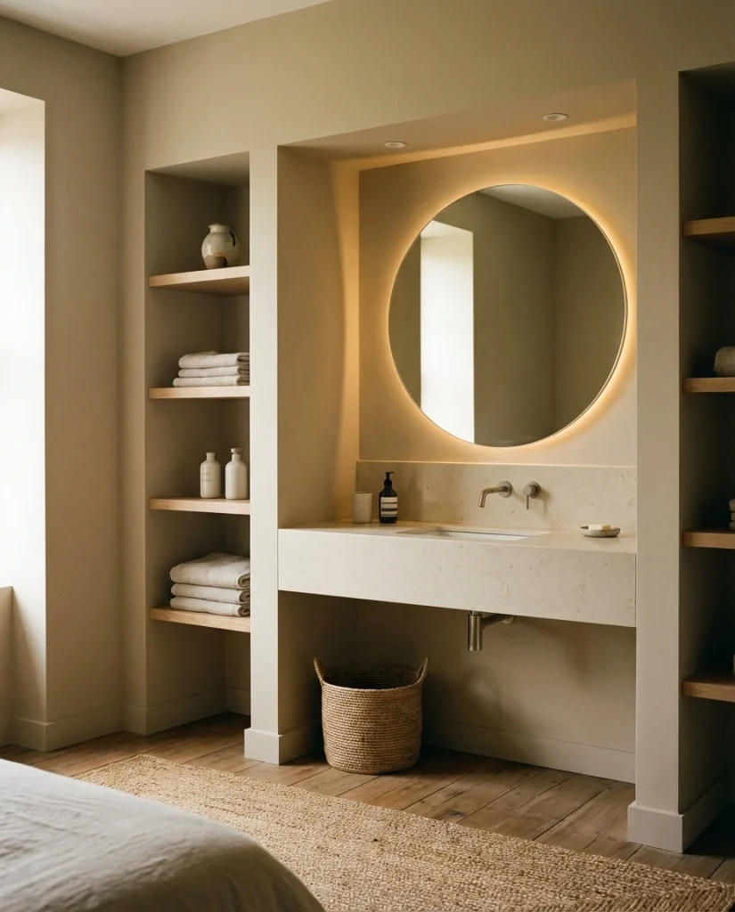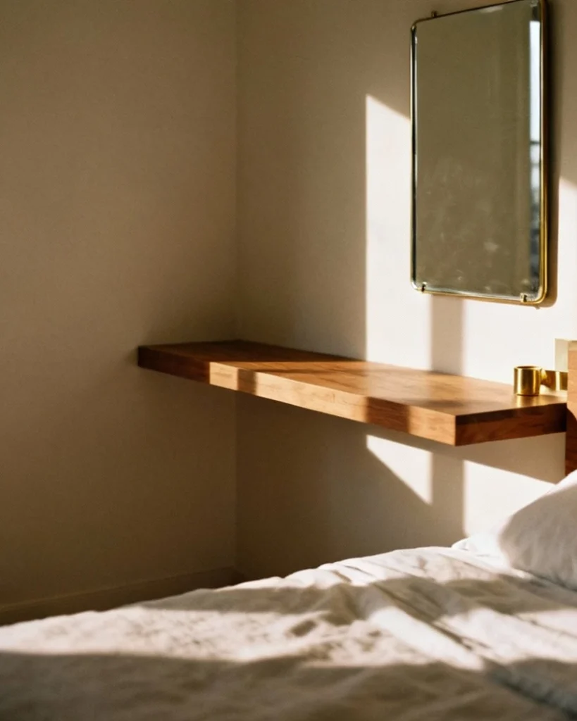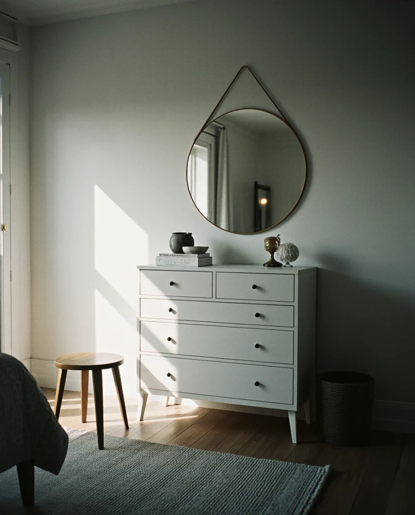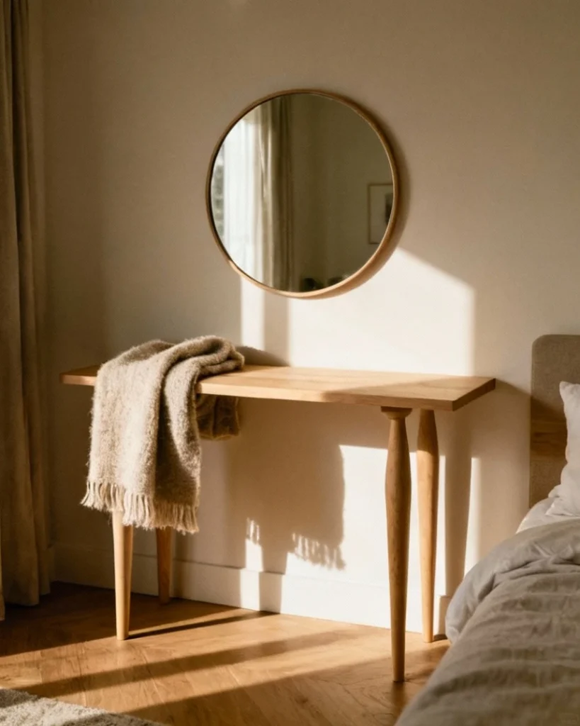 Scandinavian vanities work best in bedrooms that already embrace a neutral color scheme and uncluttered surfaces. If your room has bold wallpaper, heavy curtains, or dark furniture, this style may feel out of place. The success of Scandinavian design relies on restraint across the entire space—it’s a holistic approach, not a single-piece swap.